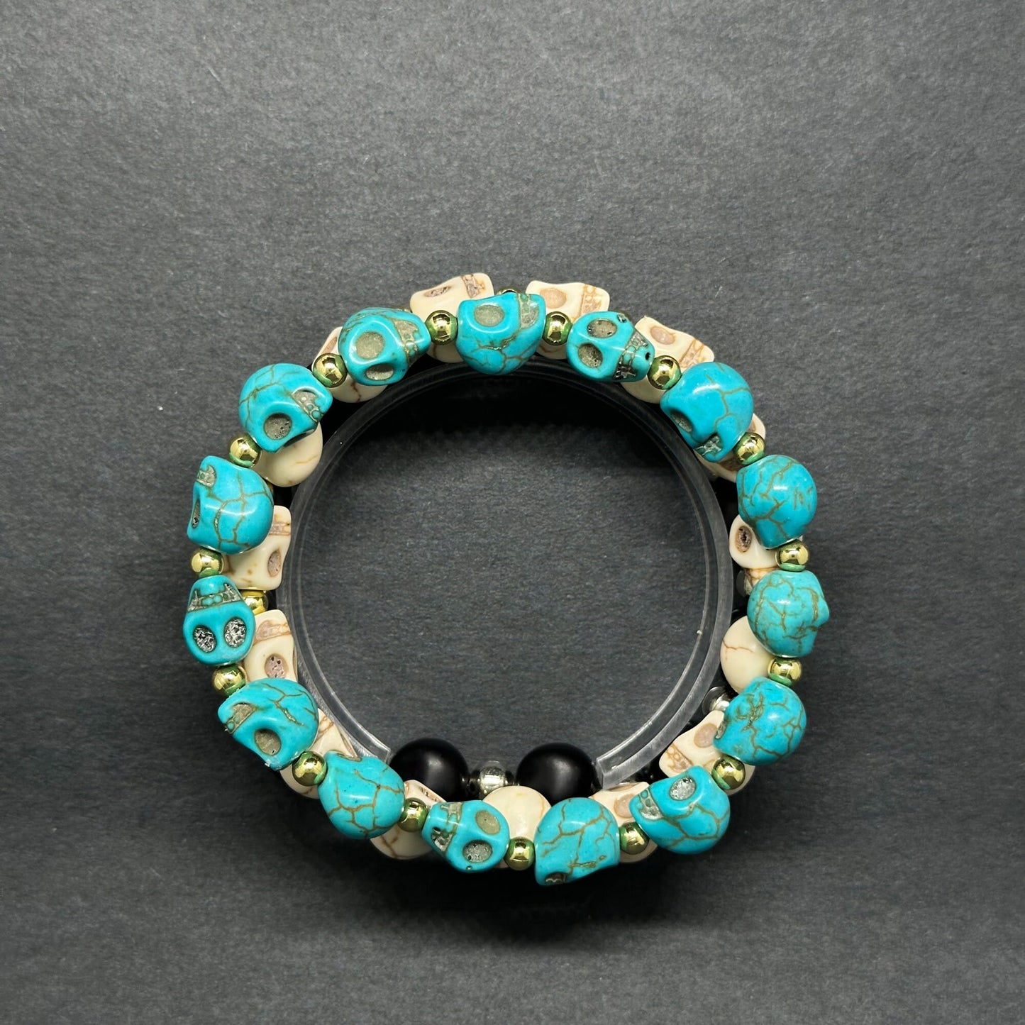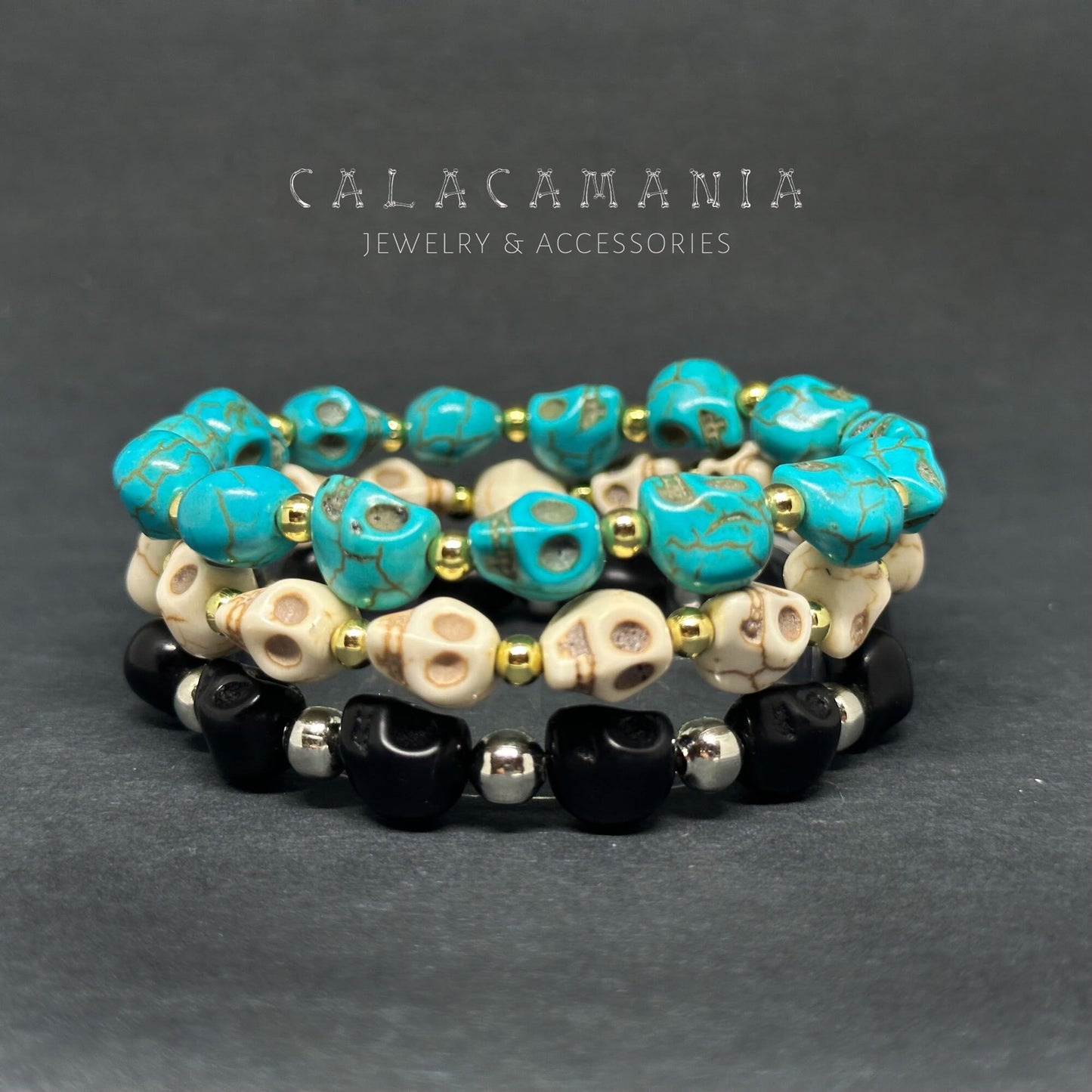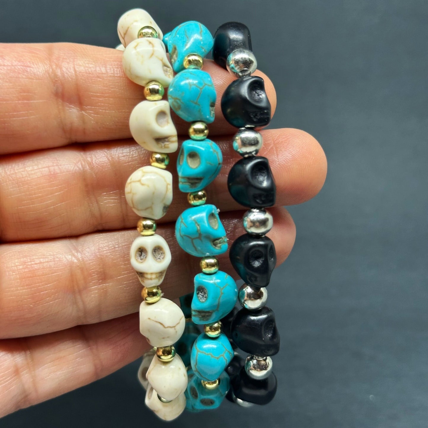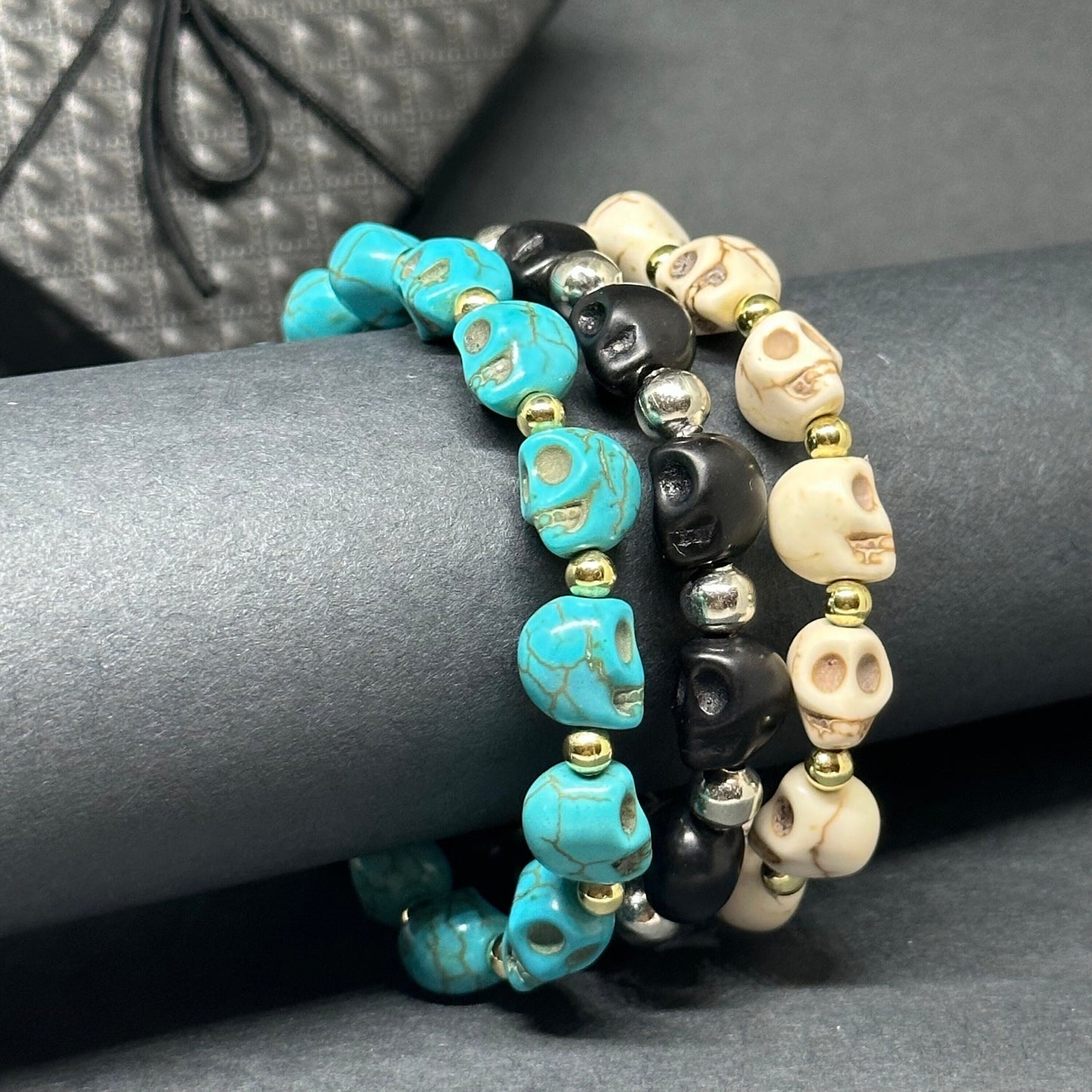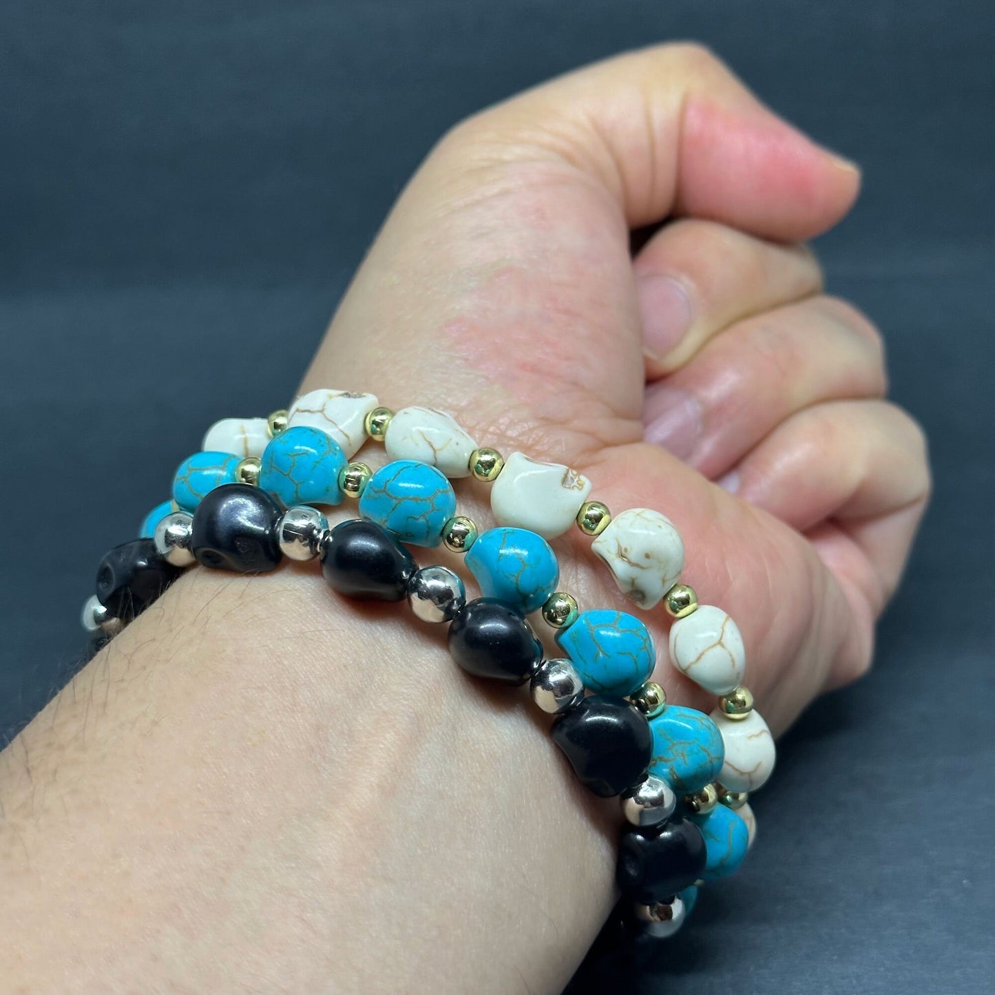 Skull Beads Multilayered Bracelet Set: Turquoise, Bone/Beige, and Black Unisex stacked skull beaded wristbands (8-10mm Beads).