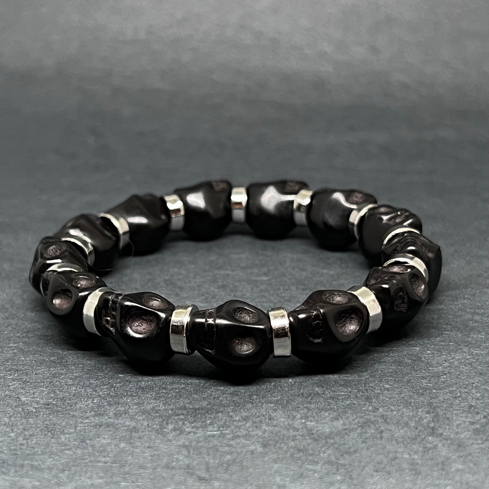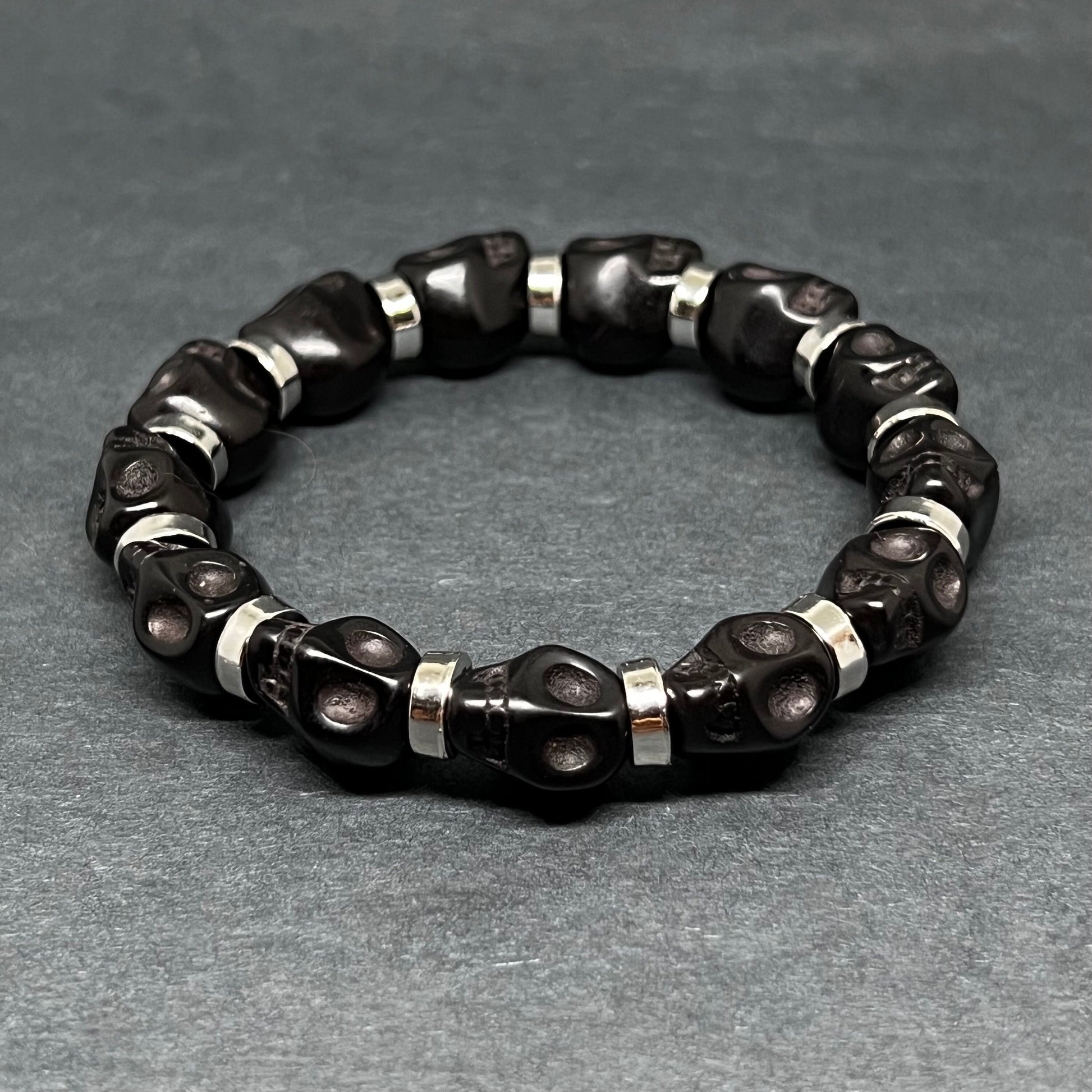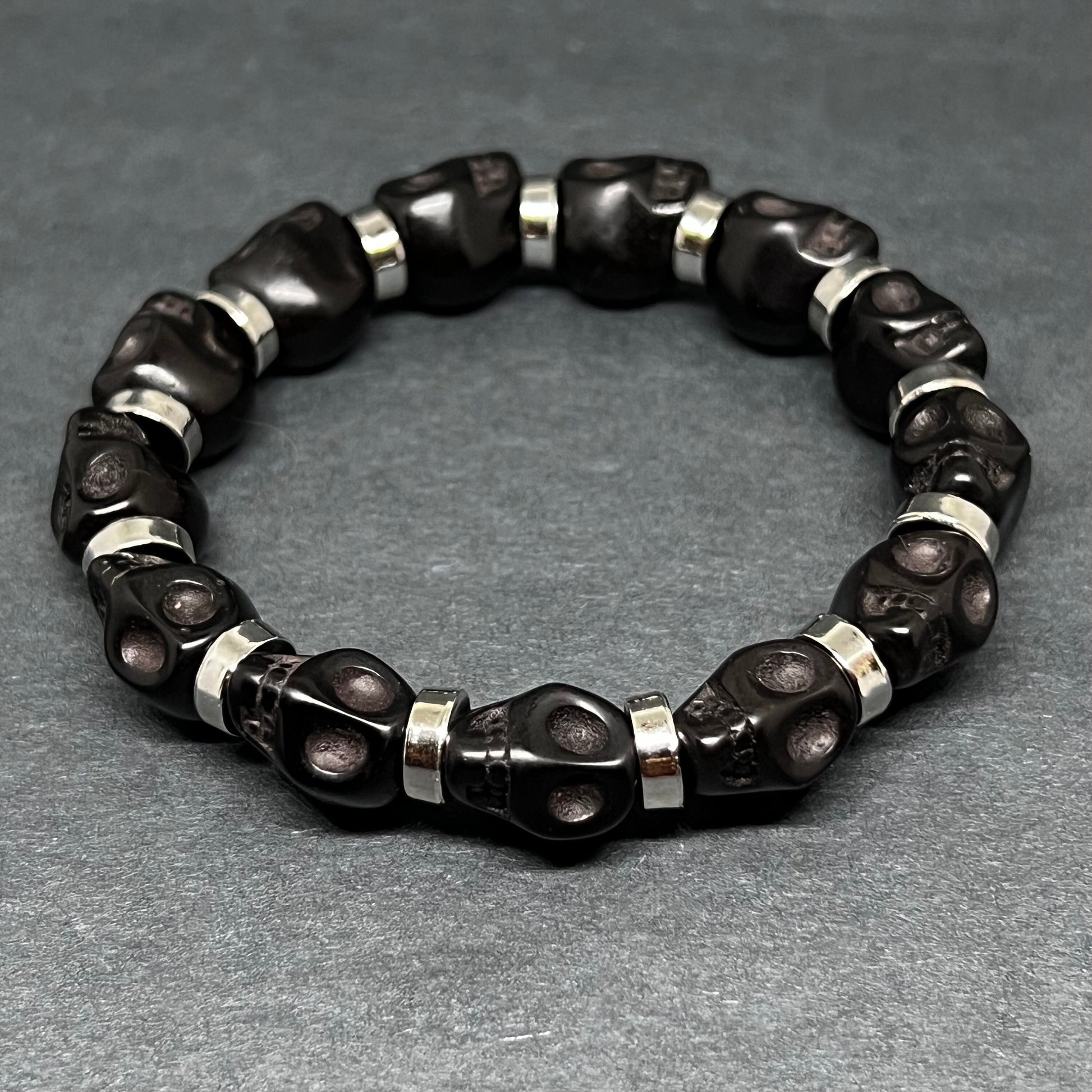 Trendy Black Skull Beaded Bracelet with Metallic Silver Steel Tone Disk Beads