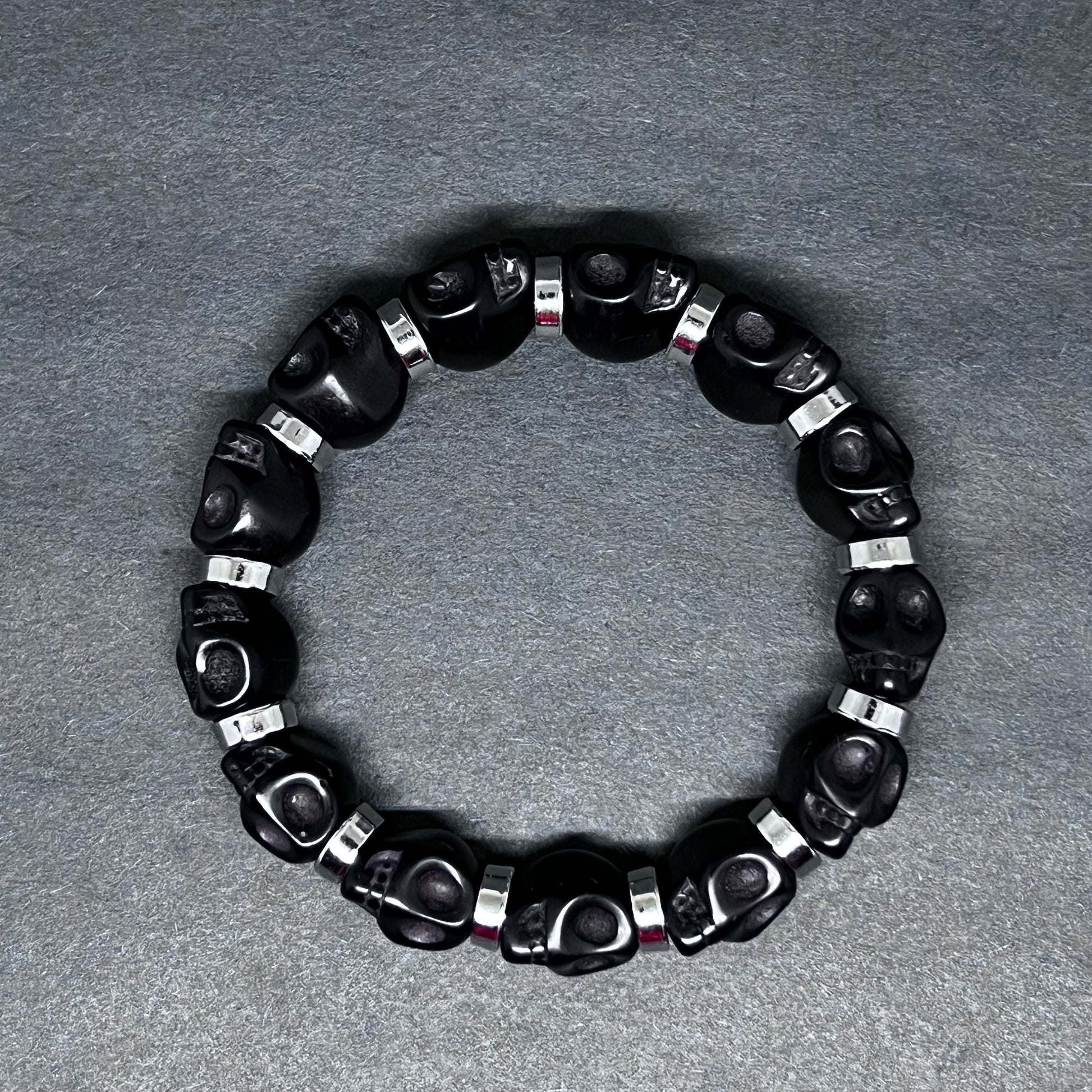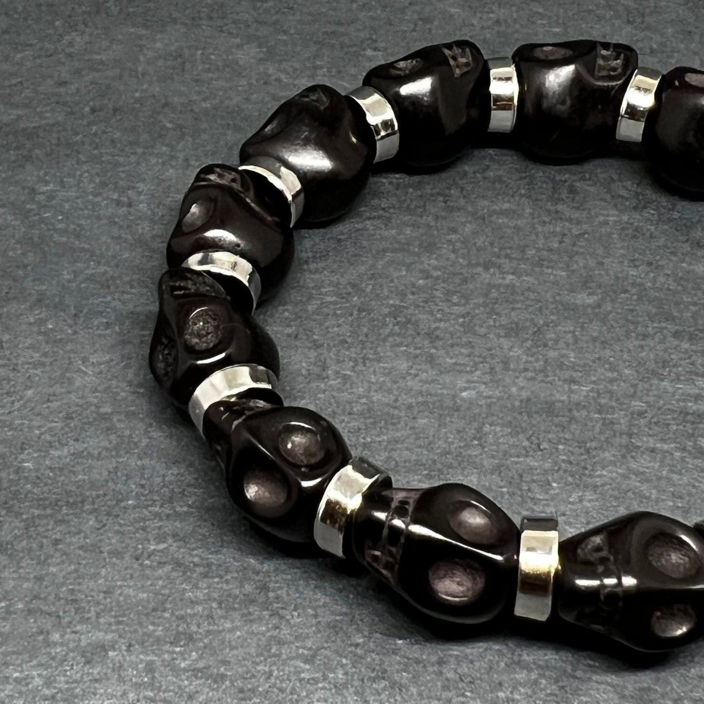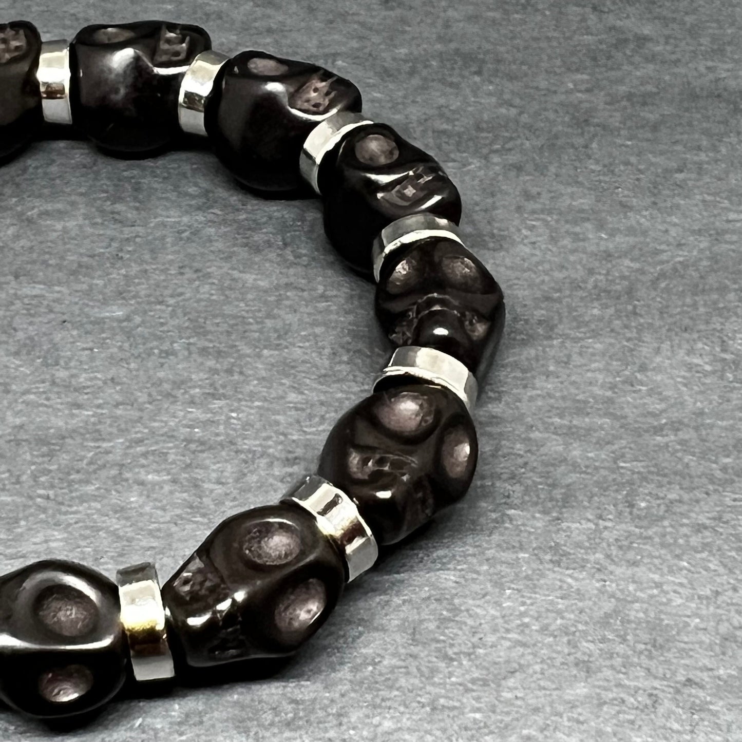 Trendy Black Skull Beaded Bracelet with Metallic Silver Steel Tone Disk Beads