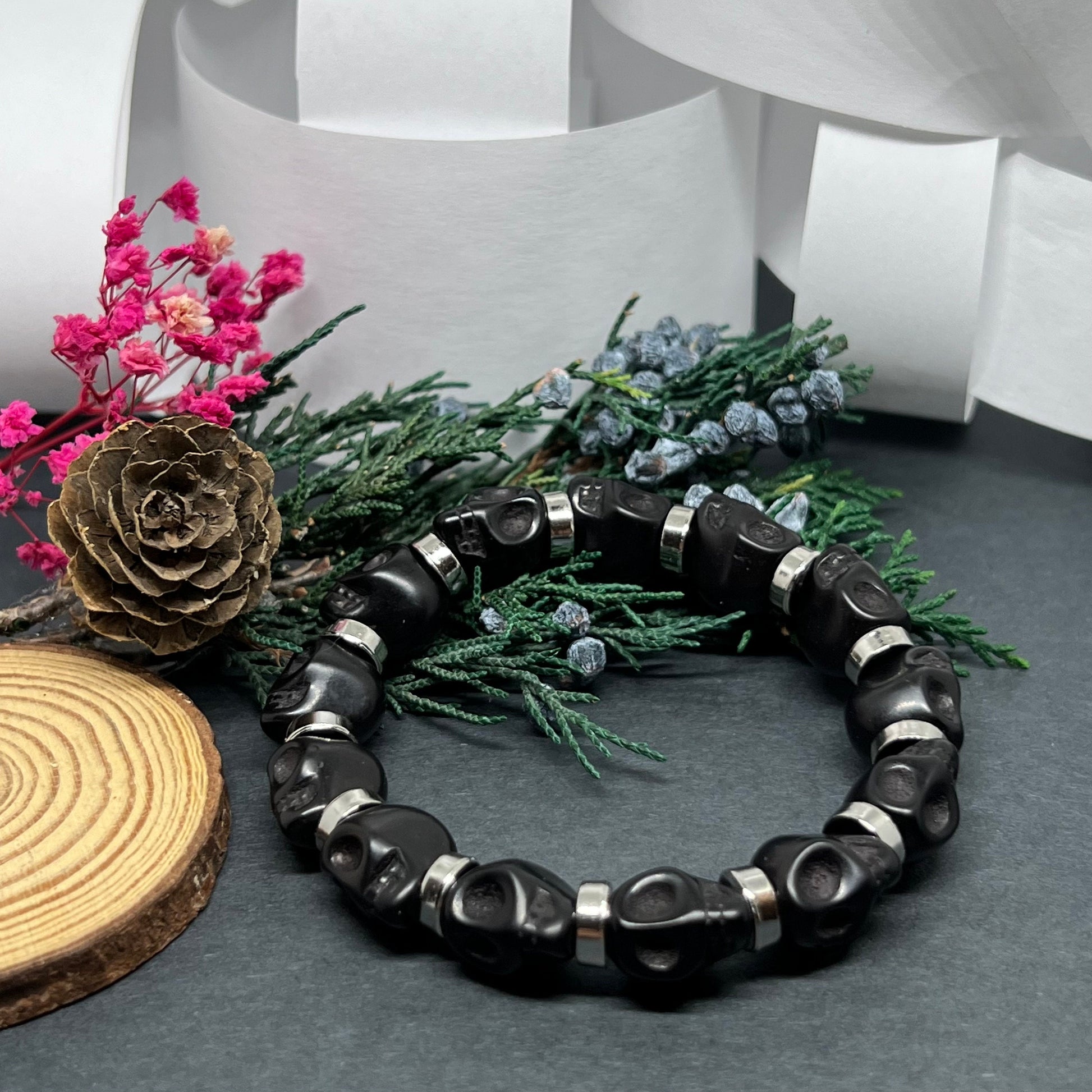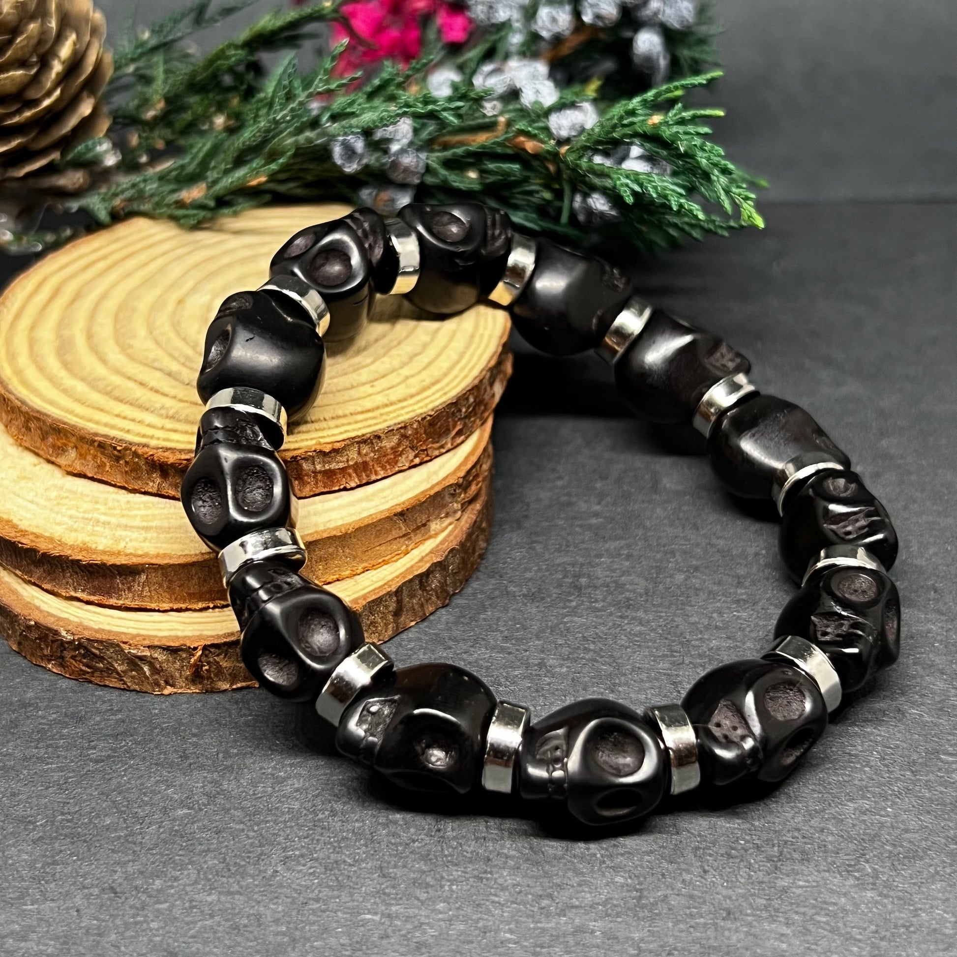 Get ready to spice up your outfit with this trendy accessory! The elastic wristband features a cool black skull and metallic silver steel beads, perfect for adding a touch of edgy style to your look. Not just for Halloween, this bracelet is a must-have for any fashion-forward guy looking to elevate his wardrobe. Plus, it's adjustable and elastic for a comfortable fit all day long. Skull jewelry accessories by CALACAMANIA™