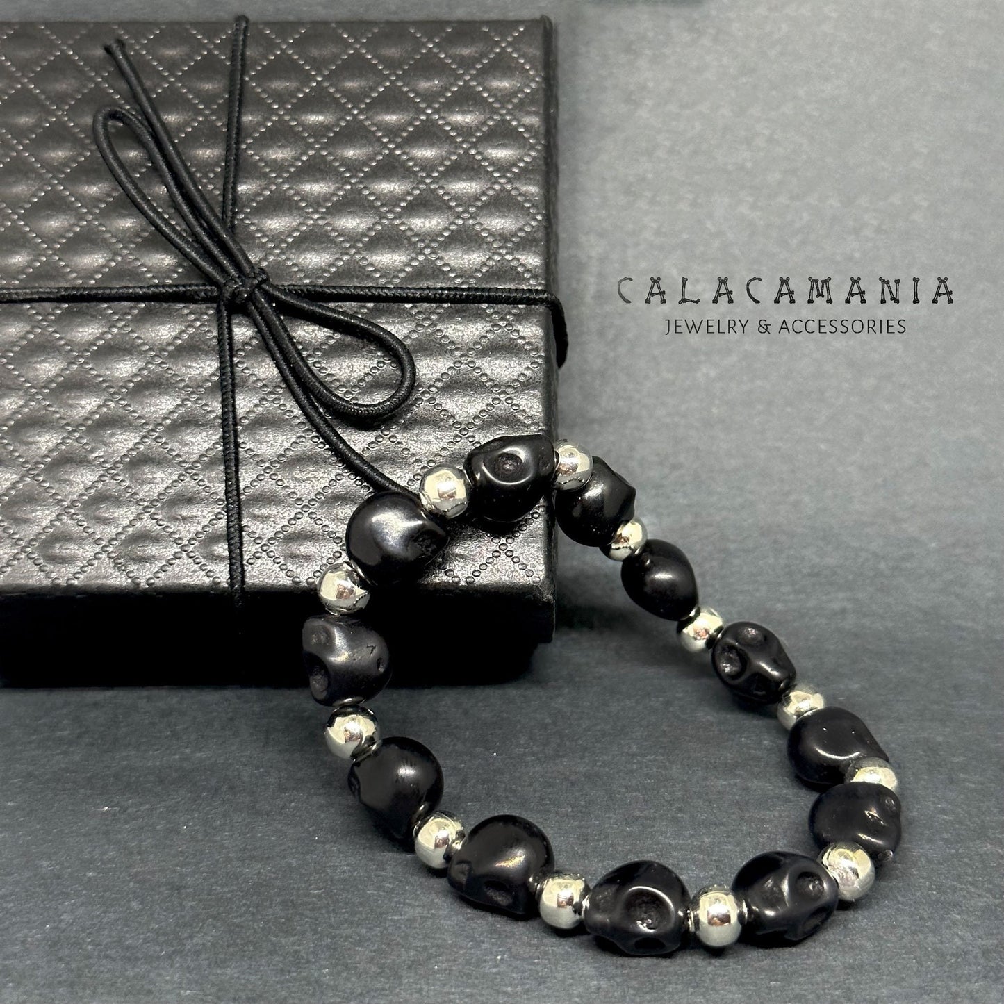 This skull-themed wristband is perfect for any gothic-punk or tattoo fashion enthusiast! Featuring black stone skulls and silver metallic round beads, this adjustable/elastic bracelet is the ideal statement accessory for Halloween or Dia de los Muertos. Rock on! Let's party!