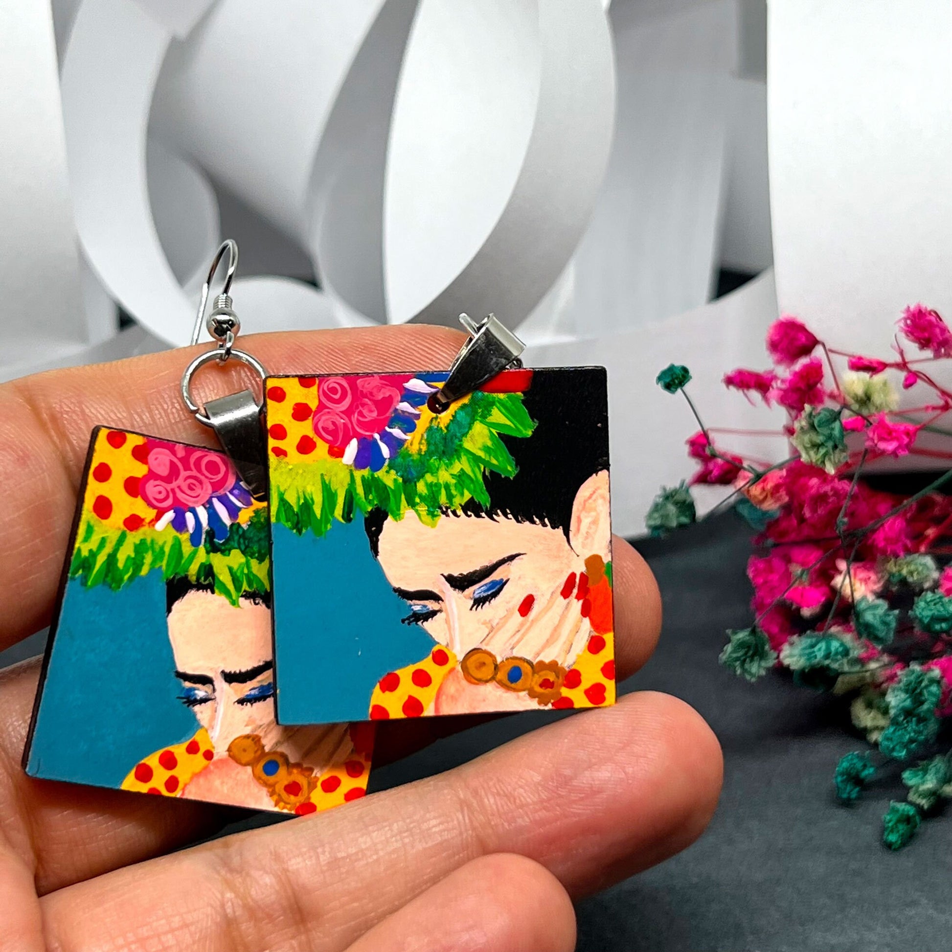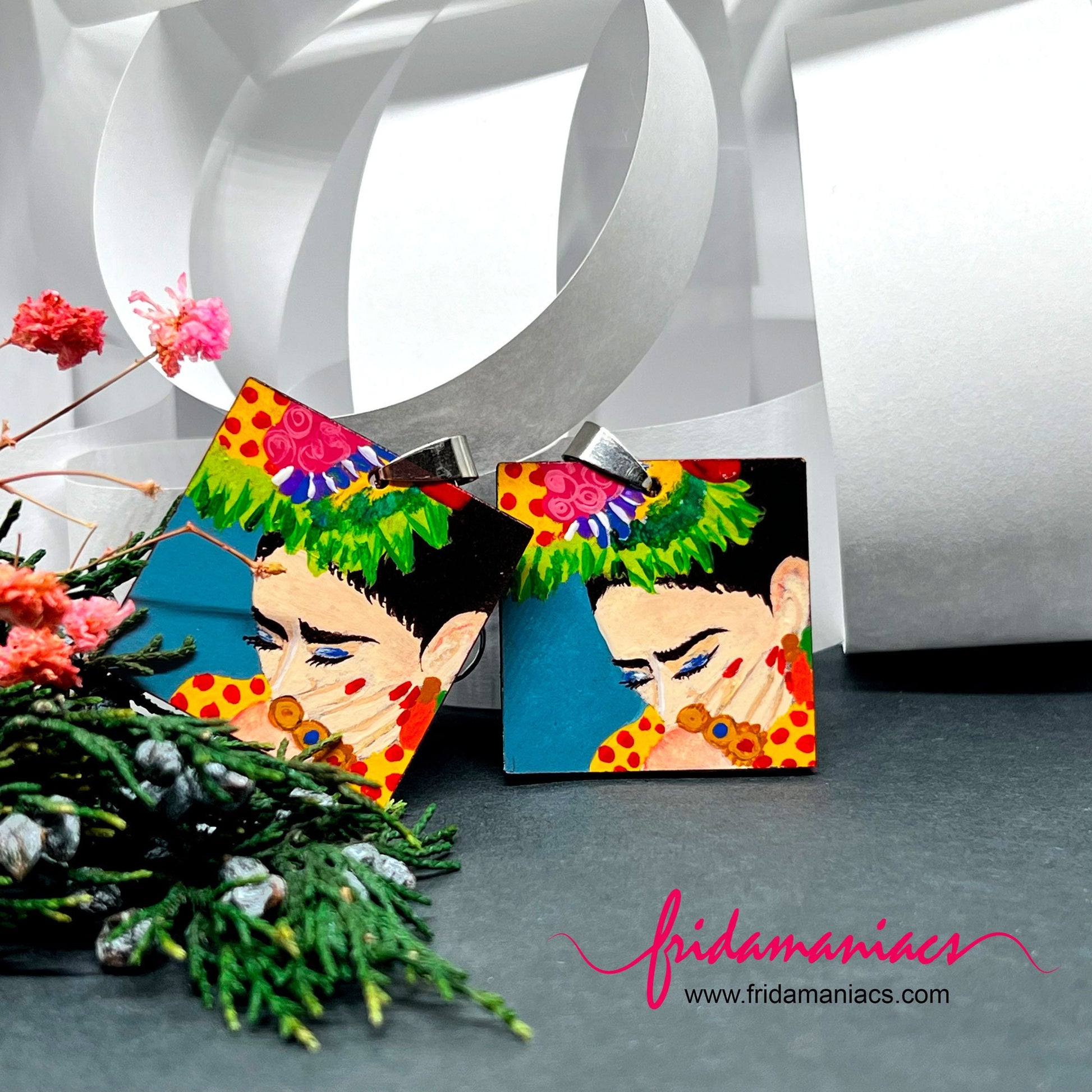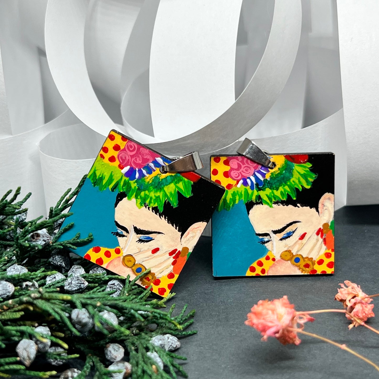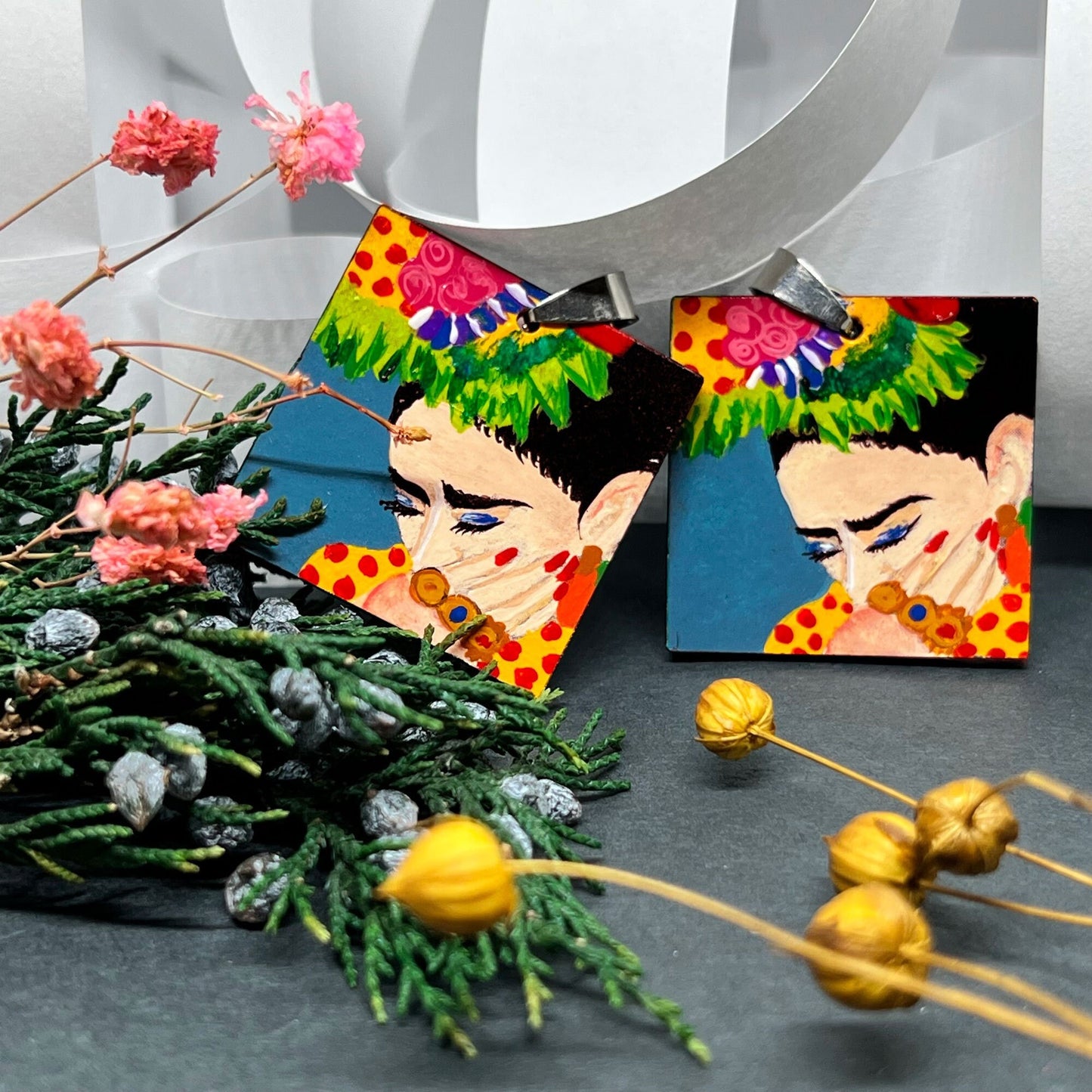 This gorgeous Frida earrings are a beautiful mini masterpiece. Original Artwork. We created them using high quality acrylic paint which had been protected with a special gloss coat to ensure its durability. Very light to wear and one of a kind accessory. It's the perfect gift for that very special person out there.