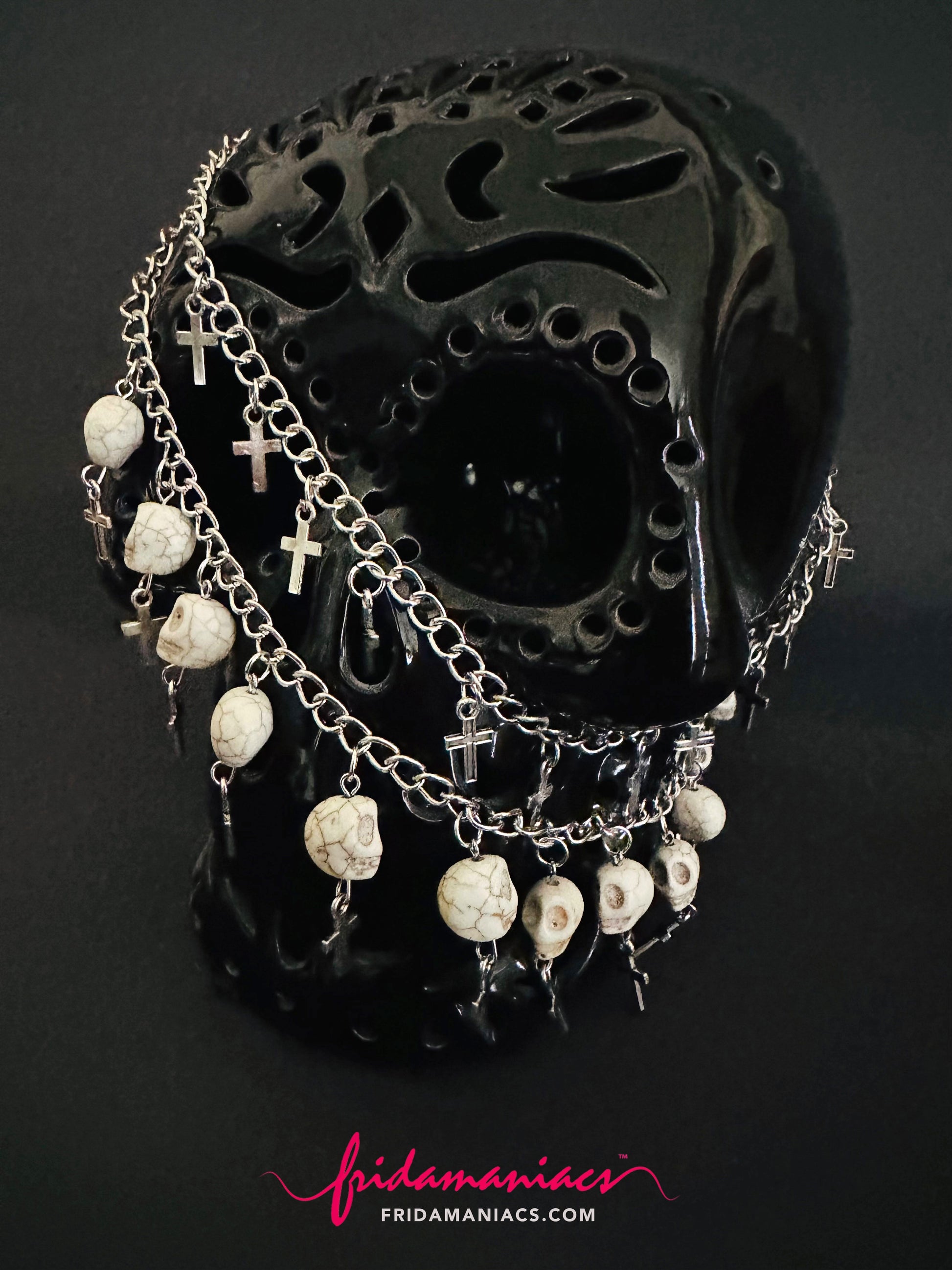 Bring the chaos in style with this double chain choker/necklace, loaded with gothic attitude and raw edge. Featuring stone skull beads in aged bone tones (think weathered & wicked), and silver-toned crosses, this layered piece nails that perfect balance between sacred and sinister.