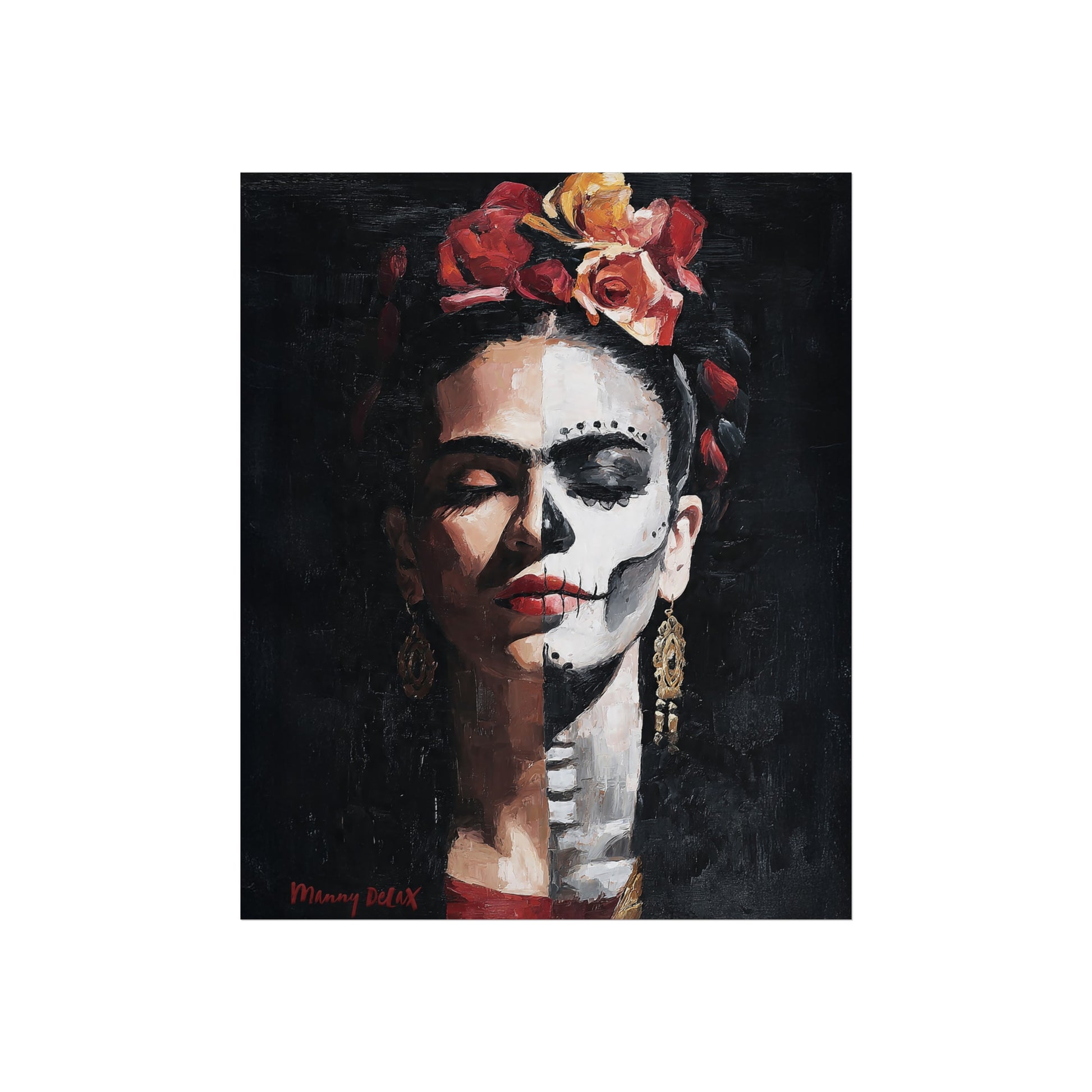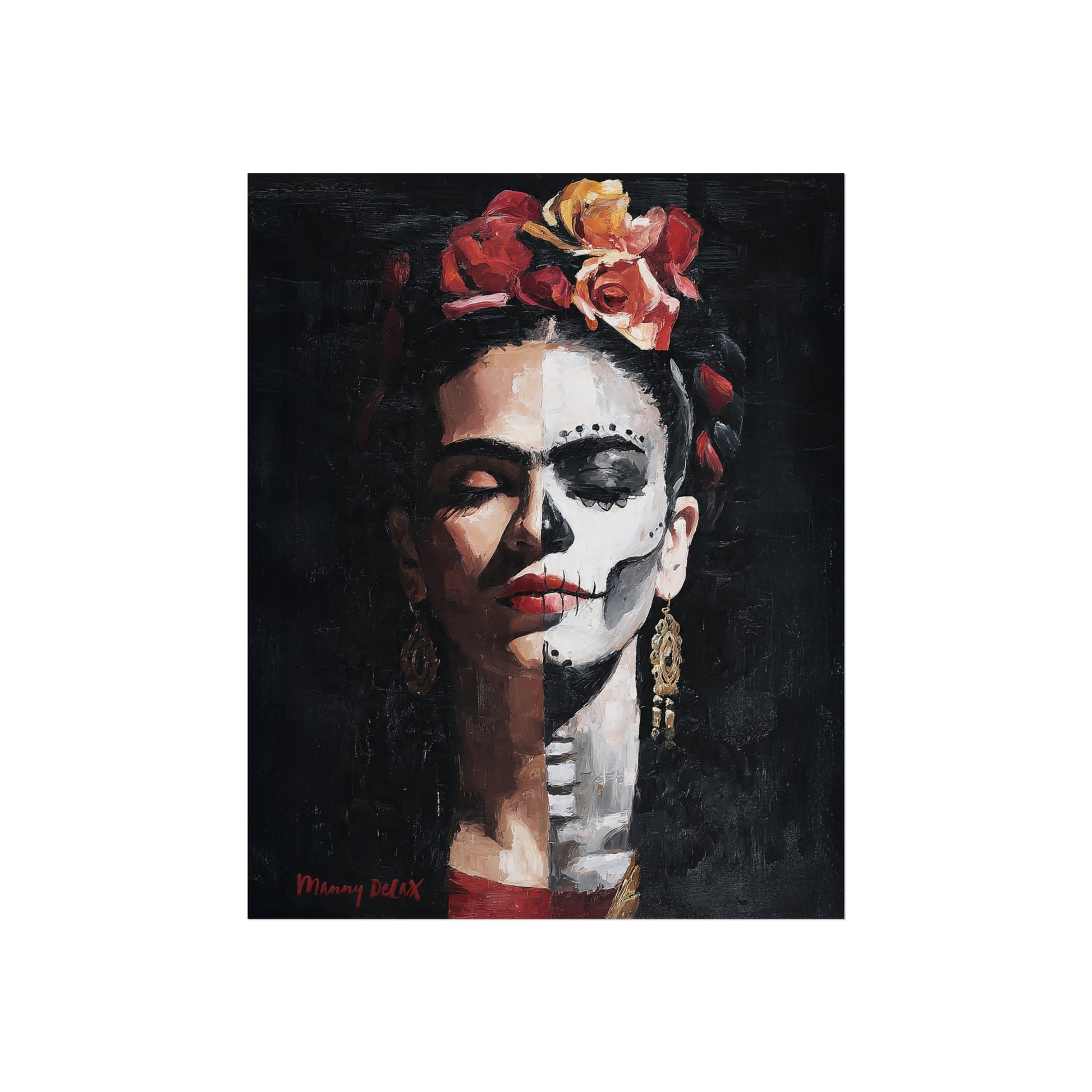 This Frida Kahlo inspired fine art poster captures the enigmatic beauty of the Mexican Day of the Dead celebration. With a half-alive, half-painted Catrina representation of Frida Kahlo, this print pays homage to the iconic artist. The dark background and vibrant colors give off a mystical and artistic vibe, perfect for art enthusiasts and Frida Kahlo fans. Ideal for decorating homes, offices, and art studios, this poster is relevant for Day of the Dead celebrations, art exhibitions, and Frida Kahlo themed events.