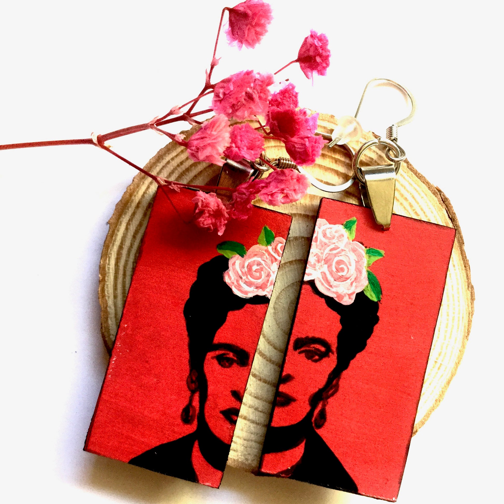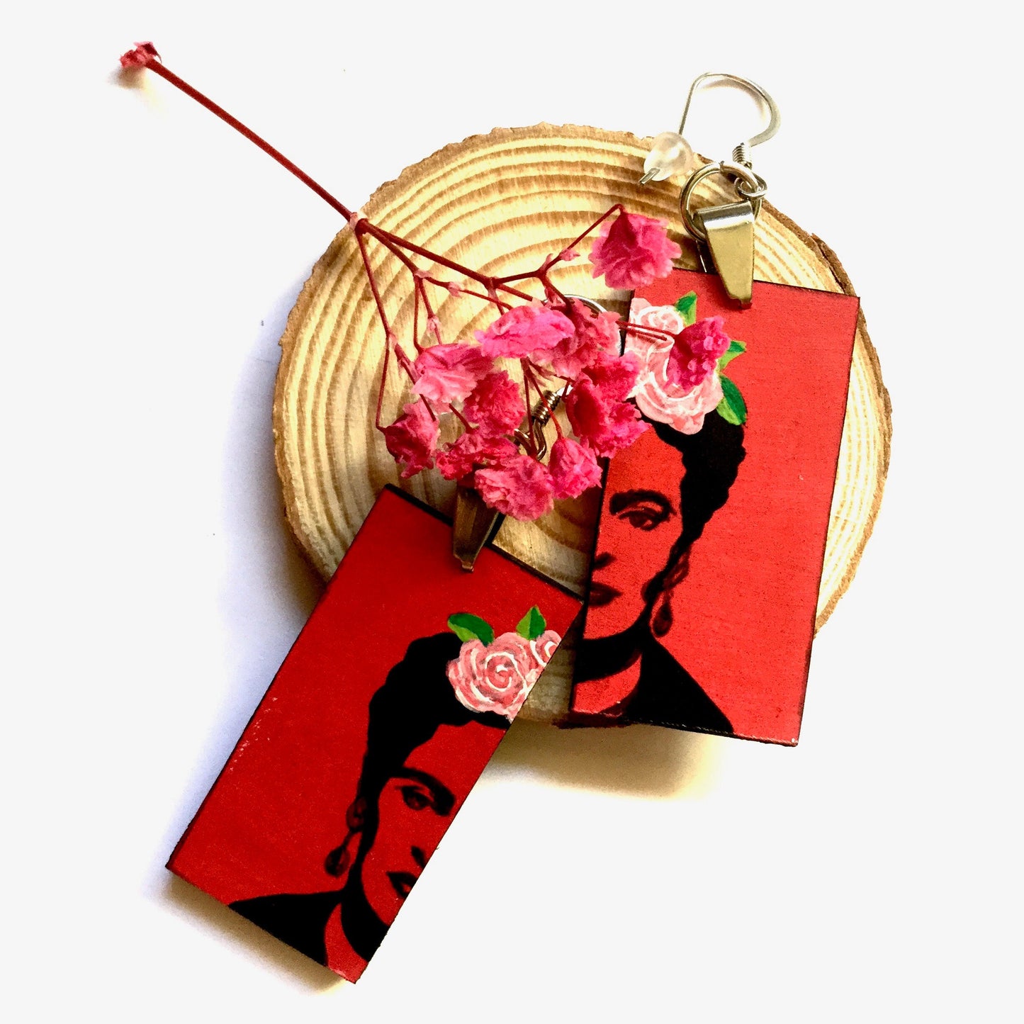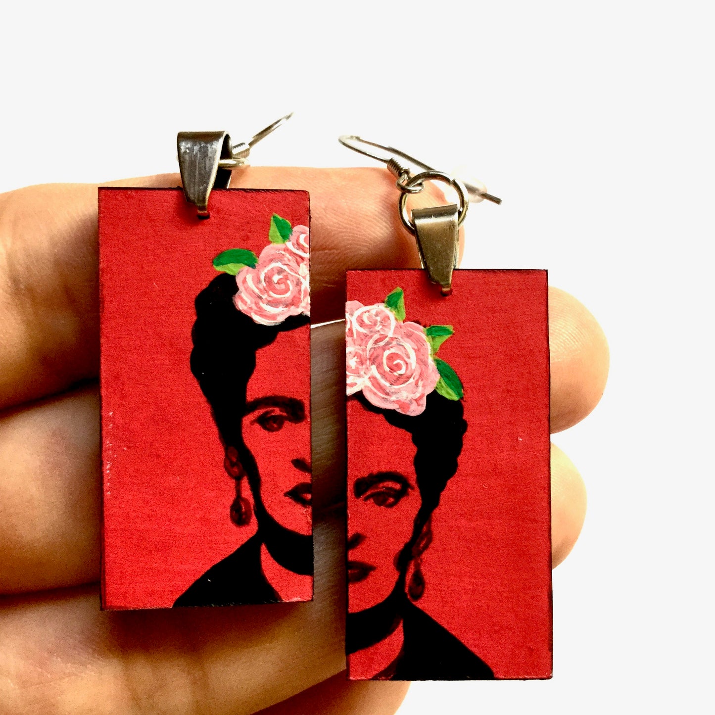 Embrace bold style with our Frida Earrings! These lightweight accessories feature vibrant red stencil art and lovely pink roses, inspired by the iconic Frida Kahlo. Hand-painted by Mexican artisans, these earrings are the perfect way to add some adventure to your fashion. A gorgeous gift for any Fridamaniac out there!