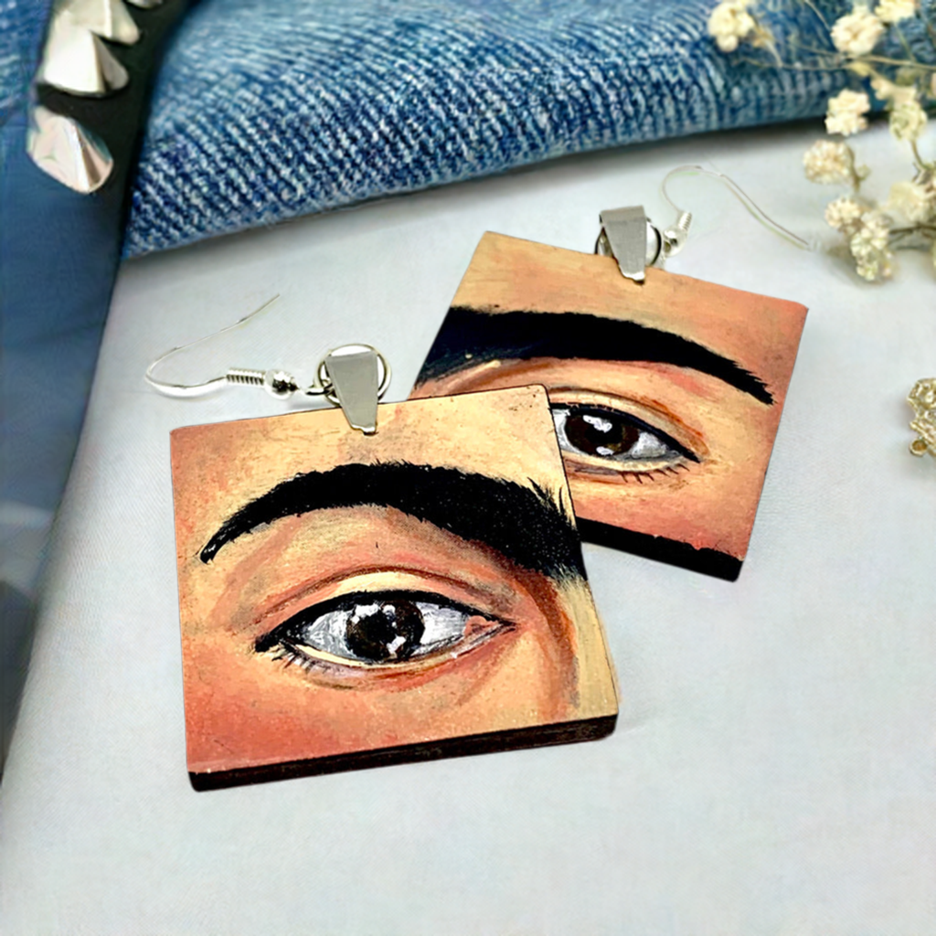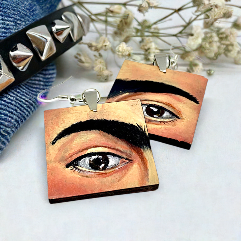 Add a touch of artistic flair to your outfit with these Frida Kahlo eye-brow earrings. These captivating hand-painted wooden square earrings feature iconic artist eyebrows and expressive eyes, showcasing fine art detail. Perfect for art aficionados or anyone looking for a cool and unique gift. Each earrings is a work of art. Add some boldness to your style - why not?! Wear them as a statement piece or gift them to someone who loves taking risks! Ideal for any art lover. Magnificent art to wear. Stand out from the crowd. These wooden earrings are a daring addition to your jewelry collection.