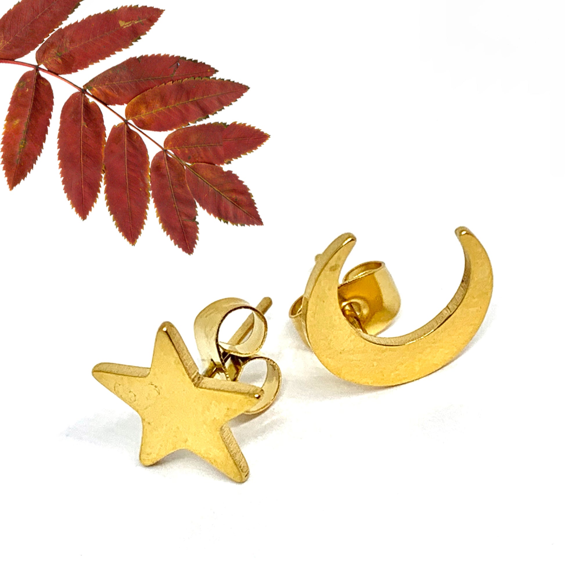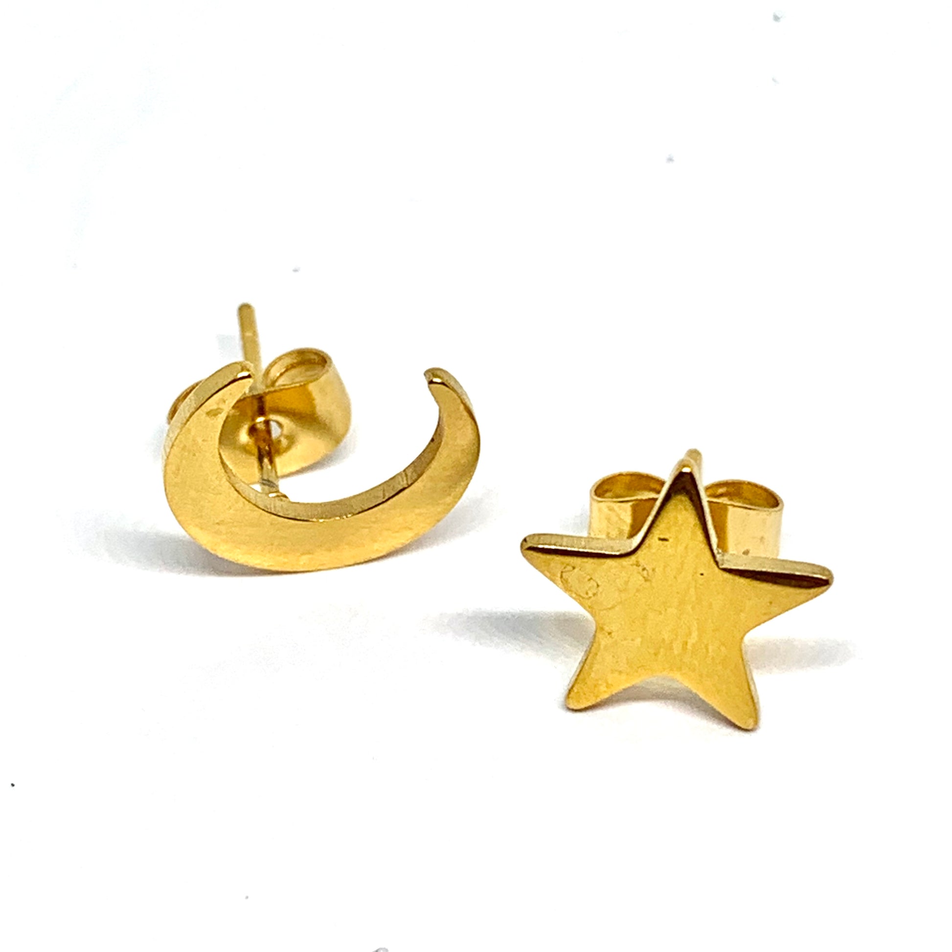 The Listing is for a Female Stainless Steel Gold Tone Star-Moon Stud Earrings. Cute Mini Stud Earrings For Girls. Minimalist Jewelry. Excellent gift idea. They are about one centimeter tall.