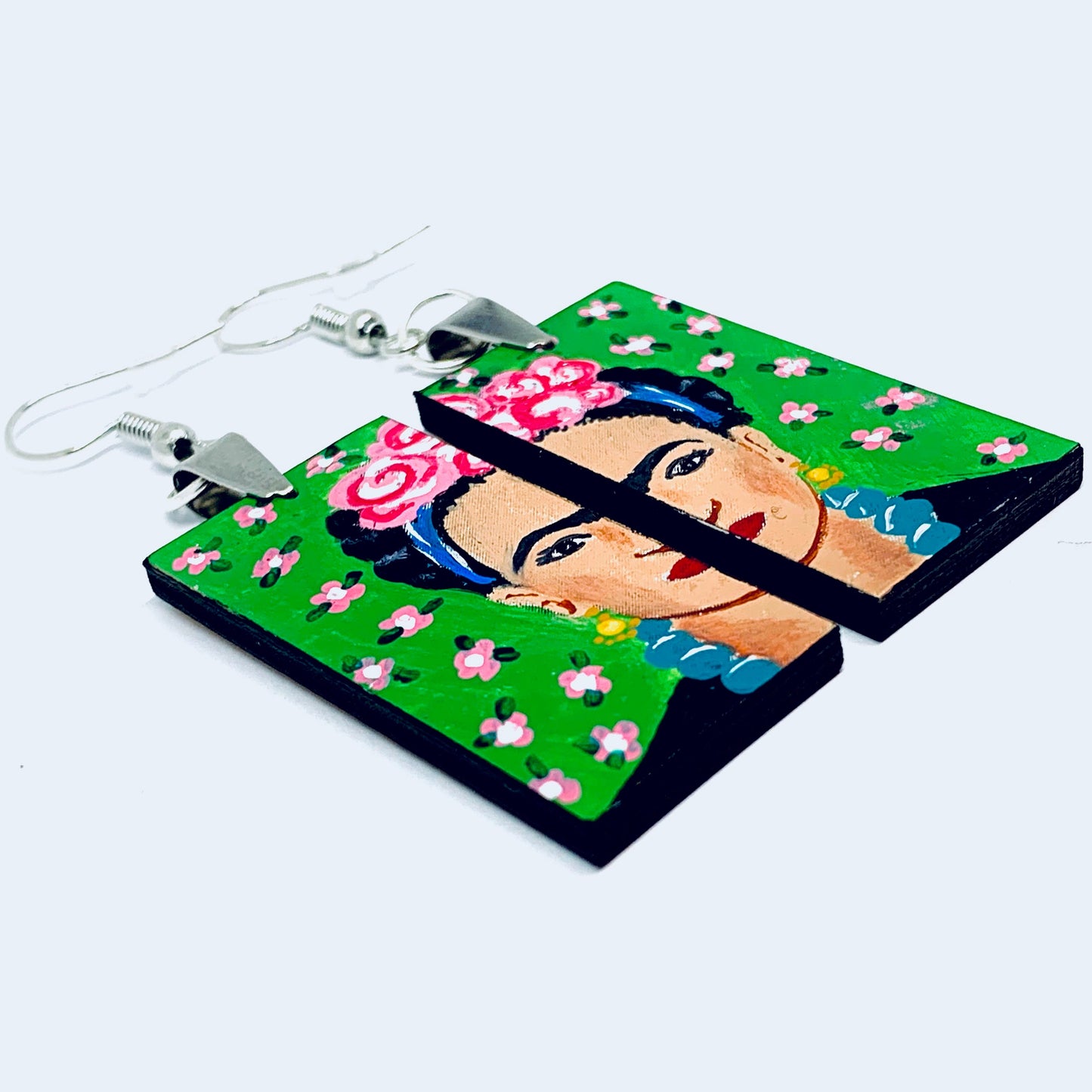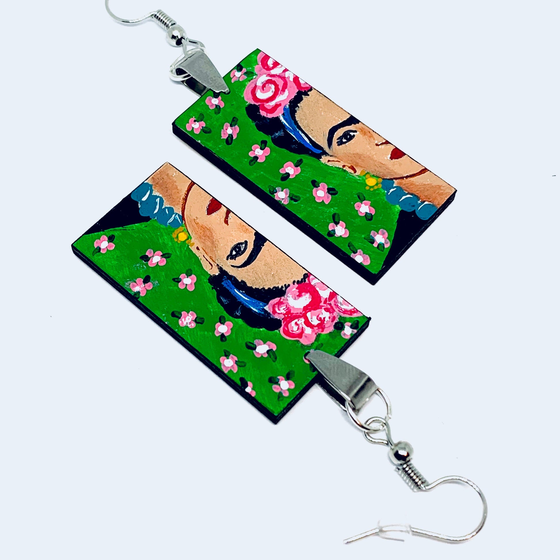 Embrace the iconic spirit of Frida with our hand painted earrings featuring her signature roses and pink flower. A wearable work of art, each pair is meticulously crafted with high quality acrylic paint and a protective gloss finish for long-lasting beauty. Lightweight and one-of-a-kind, it's the perfect gift for any Frida lover. Elevate your style with these Mexican inspired earrings. Experience the beauty and passion of Frida Kahklo. These Mexican-inspired earrings painted with green accents are a true work of art. Each pair is expertly crafted with high-quality materials and a protective gloss coat, ensuring durability. Lightweight and unique, these earrings make for a perfect gift for that special someone who loves all Kahlo inspired things. Don't miss out on this fashionable and one-of-a-kind addition to your accessory collection!
