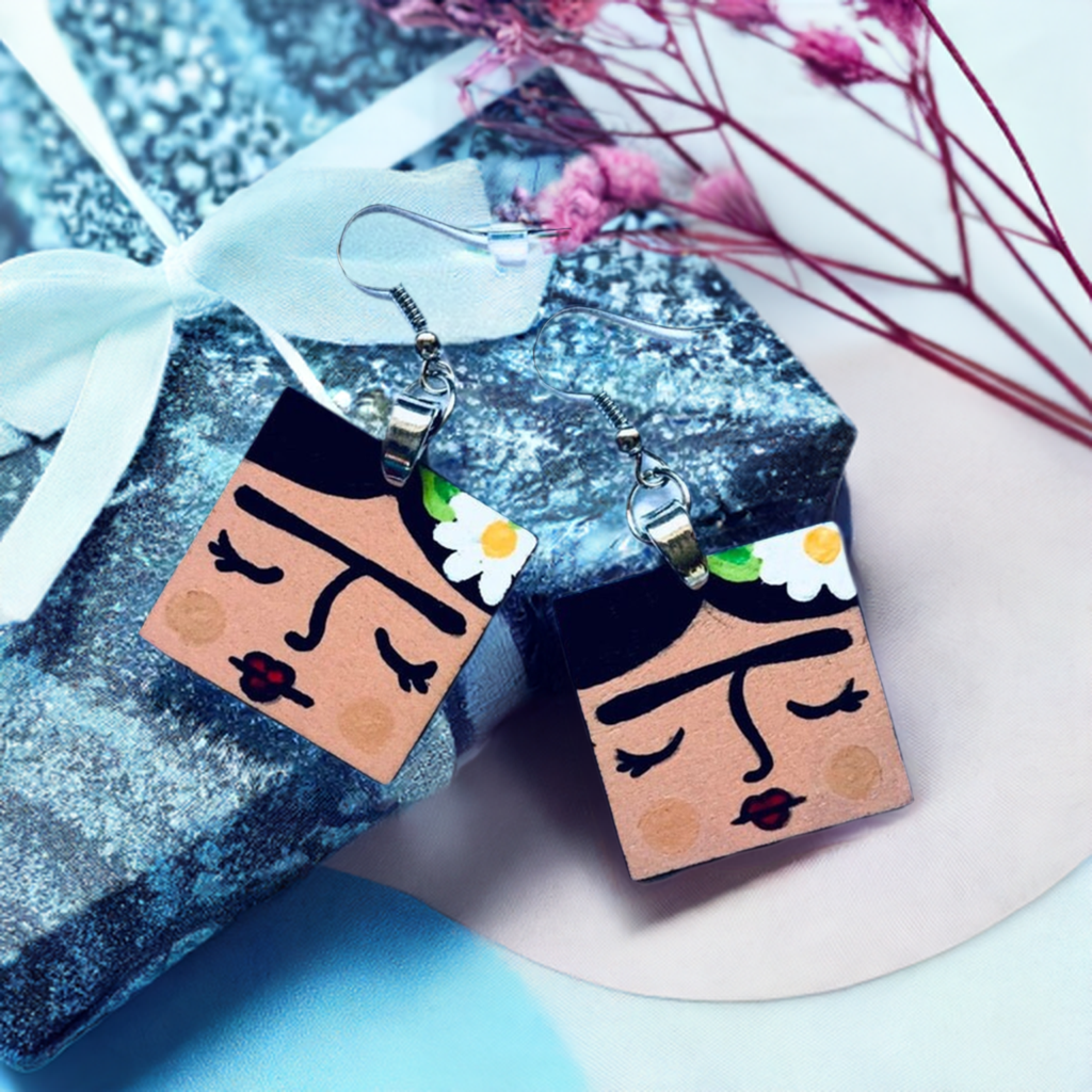 Experience the beauty of original wearable art with these Hand Painted Square Wooden Frida Earrings. Each pair is lovingly crafted by hand, from assembling the metal jump rings to carefully painting the intricate designs. No prints, only original artwork that showcases our passion and dedication. The high quality acrylic paint and protective gloss coat ensure these earrings are both stunning and durable. These one of a kind earrings are sure to make the perfect gift for that special someone in your life.