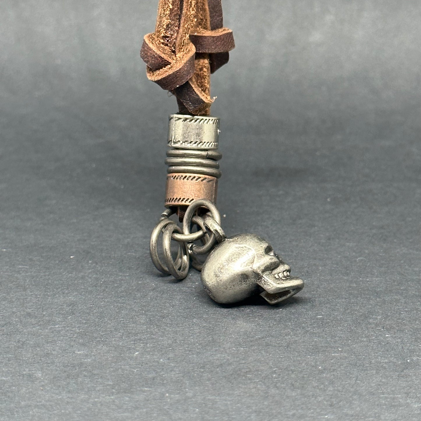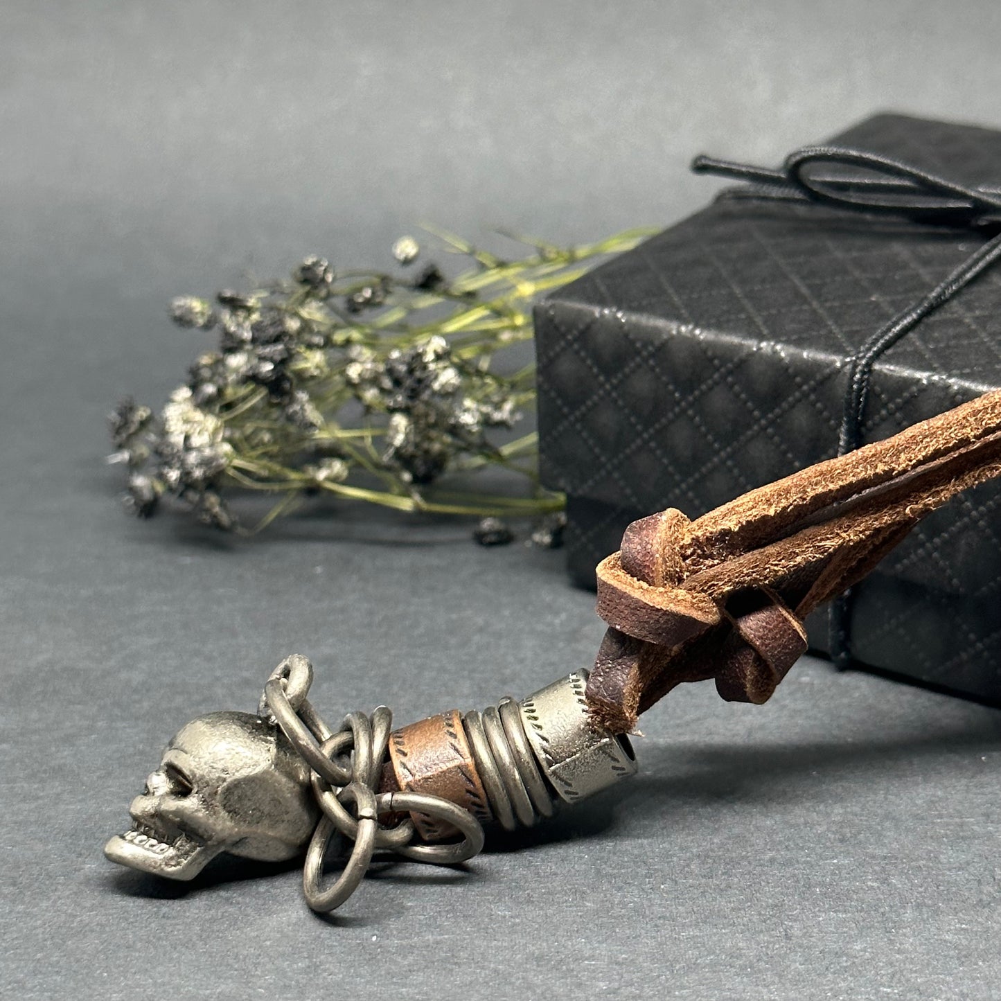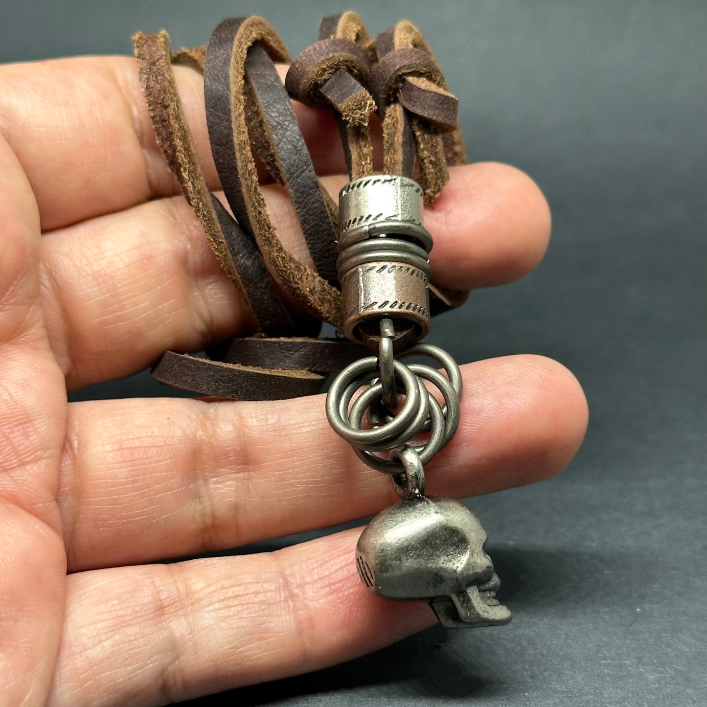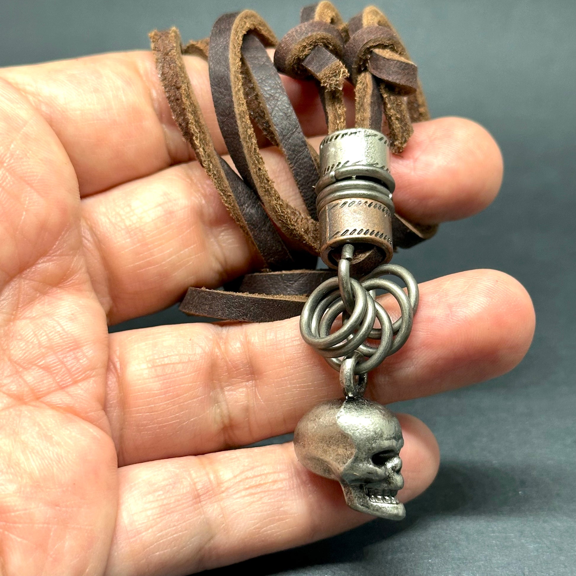 Experience the edgy and bold style of our pleather Leather Skull Pendant Necklace for men. With a striking Titanium Gray Metallic Silver Tone Skull Charm and Rings Skeleton Calavera, this necklace is the perfect gift for any man in your life. The adjustable leather cord adds a touch of versatility and the brown bonded leather material adds a touch of vintage punk flair. Make a statement with this unique neck-piece and add it to your collection today!