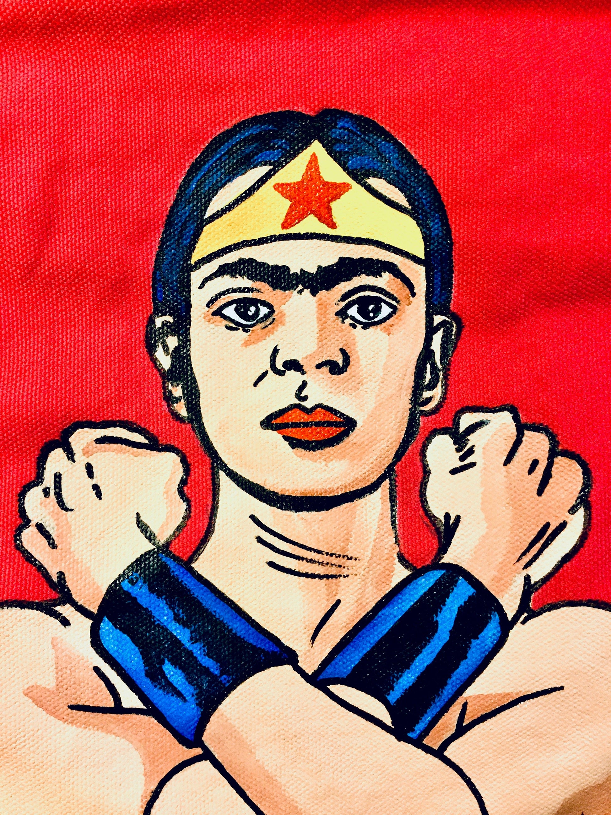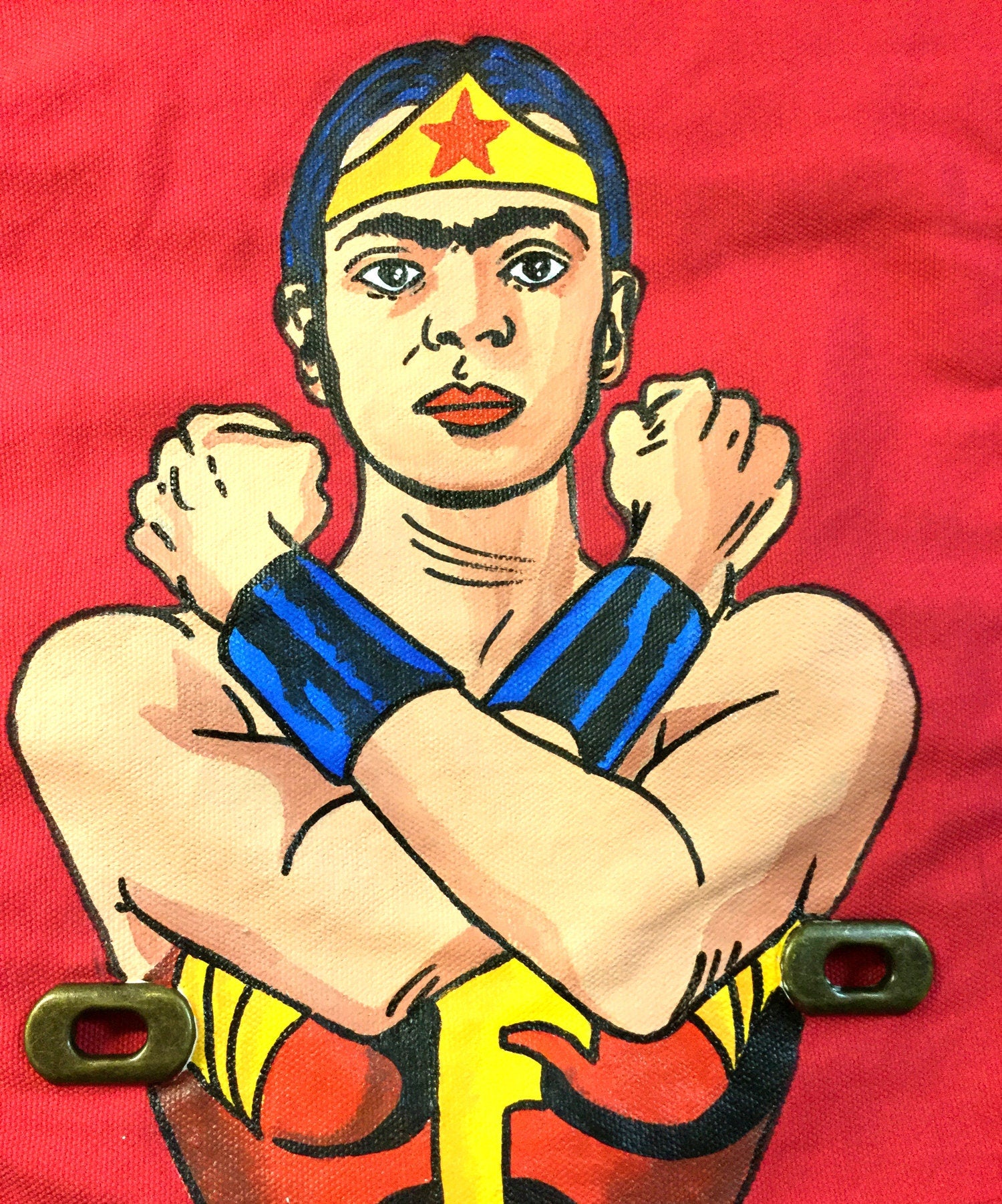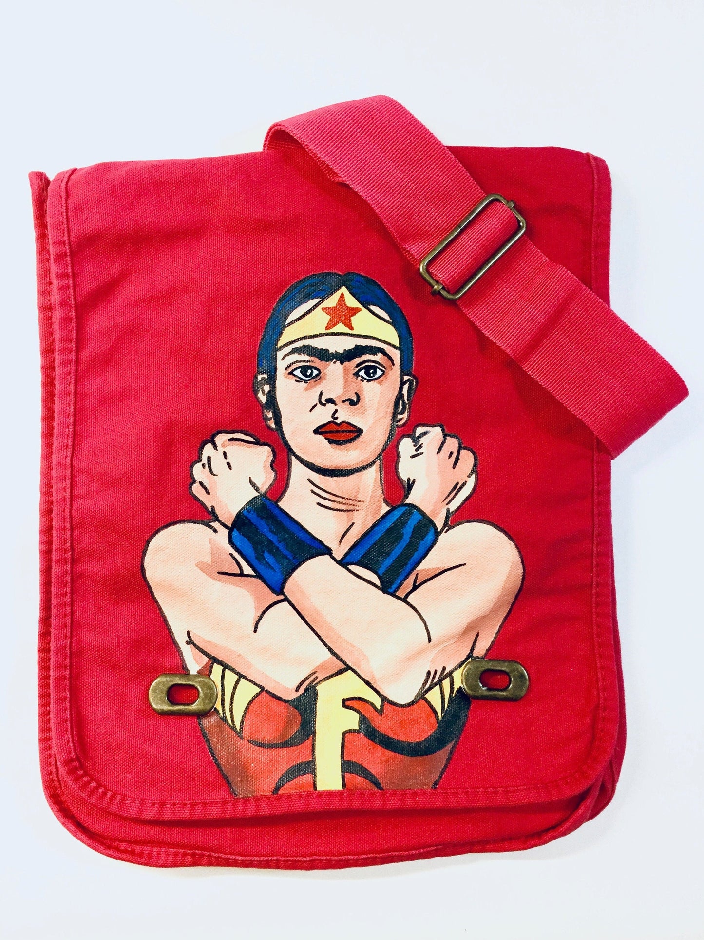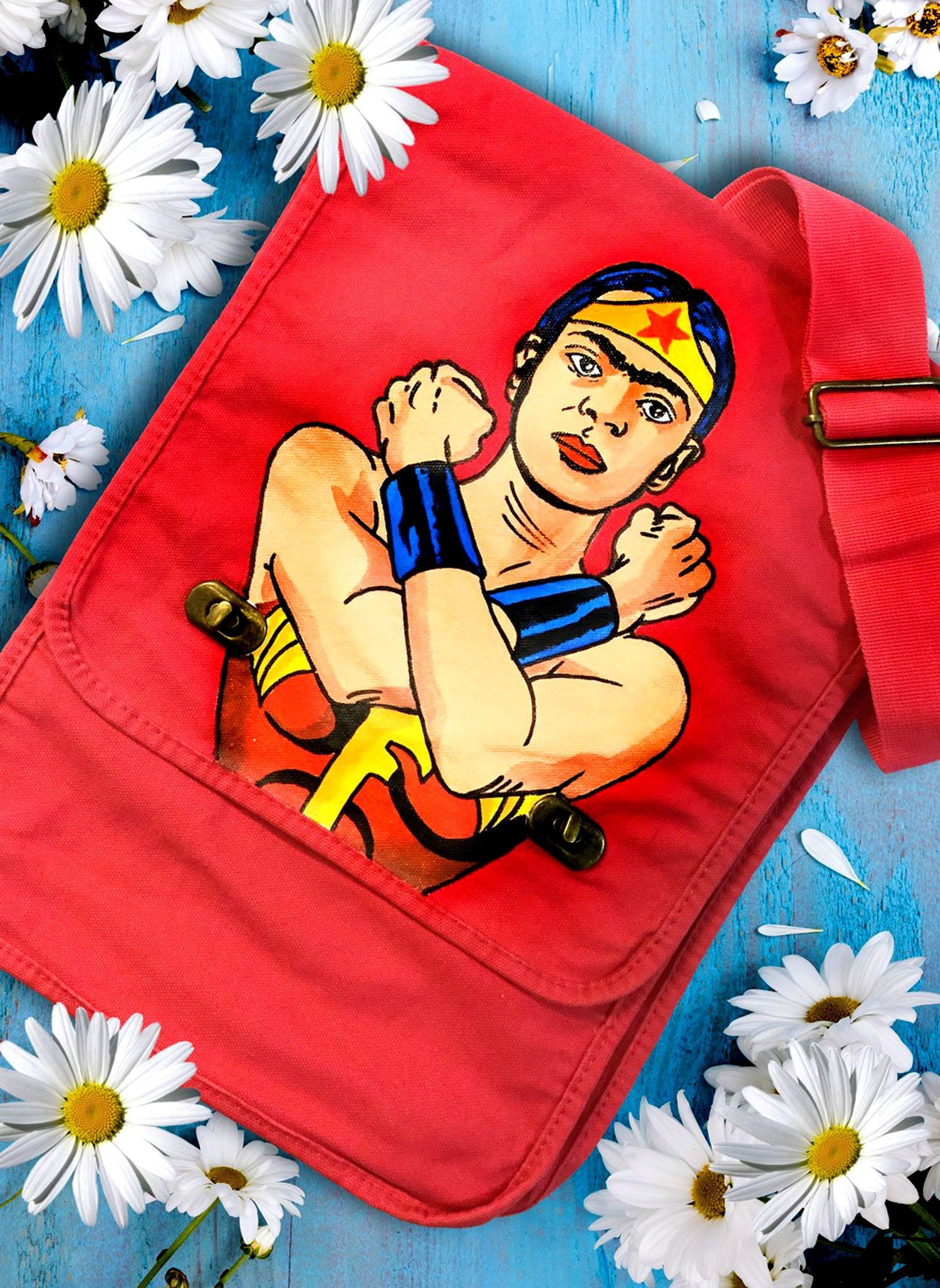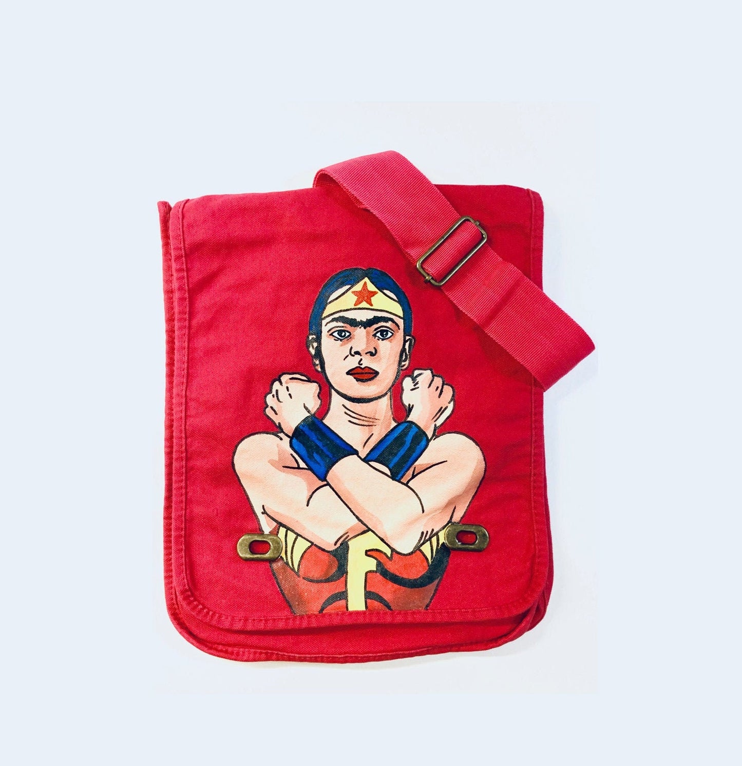 Feminist Frida inspired bag. Shoulder or crossbody hand painted messenger bag. Pinkish-Red Canvas fabric bag for her. Uniquely designed art to wear. Wearable art fashion gift idea for Frida Kahlo fans. Fridamania fashion accessory.