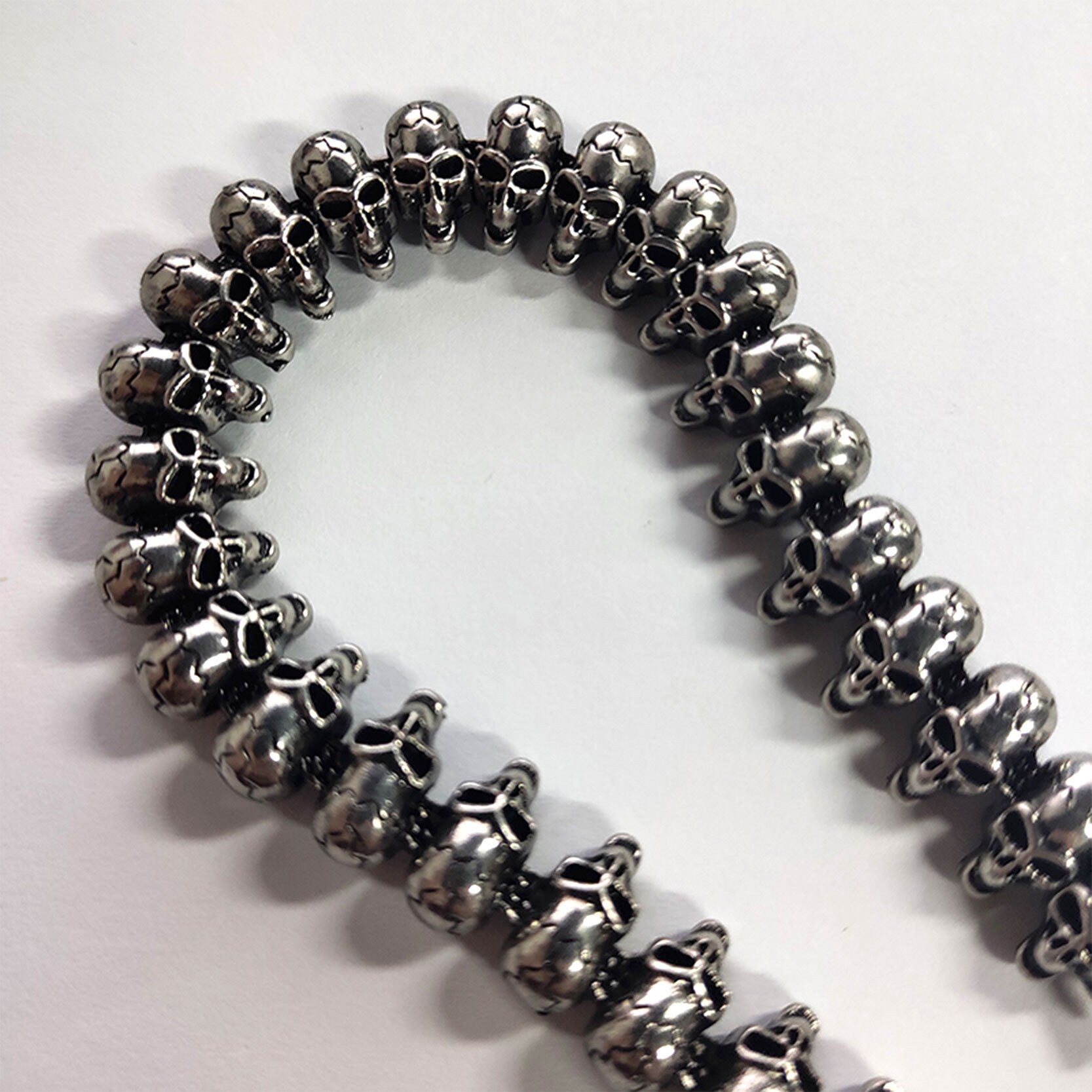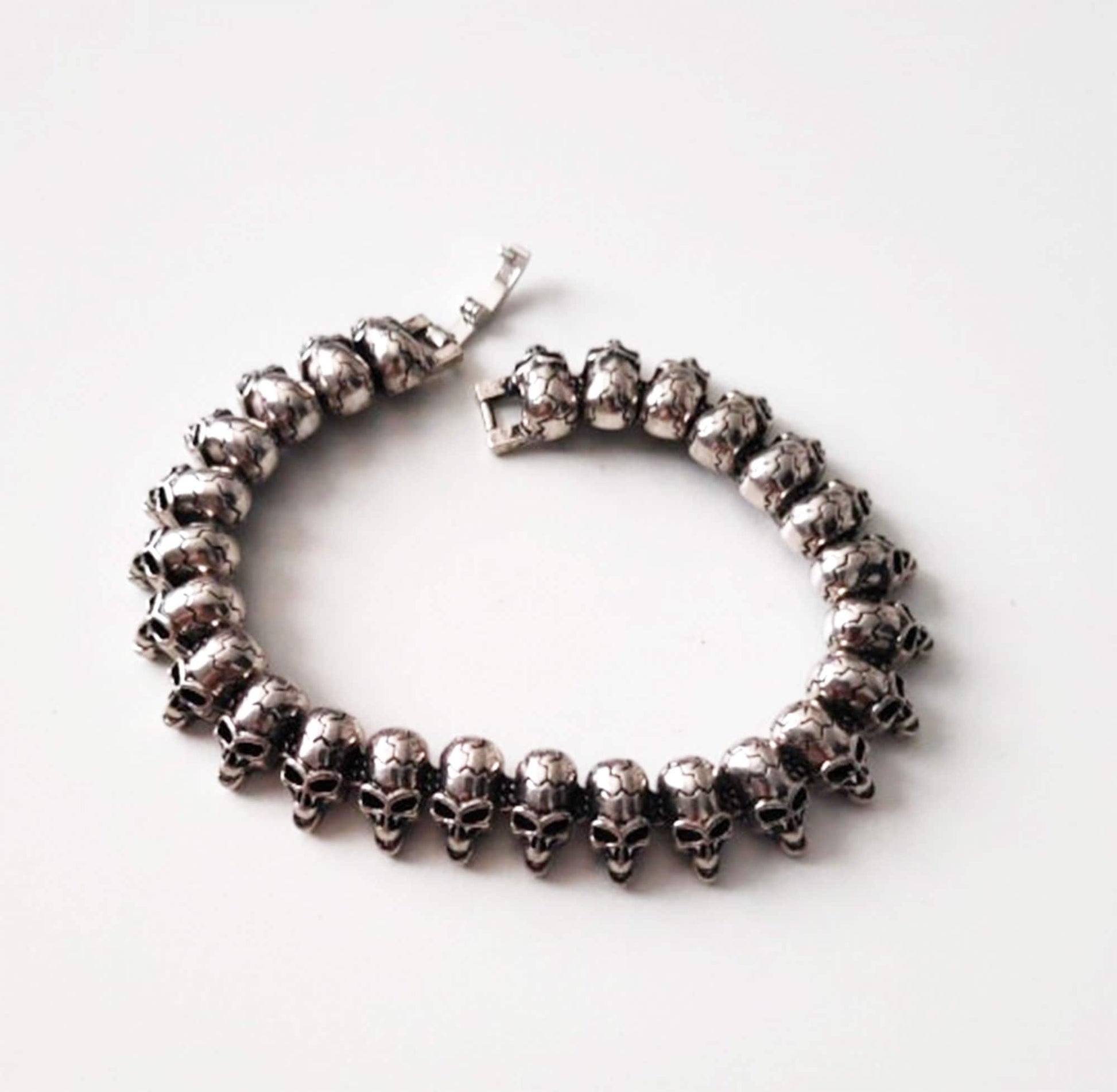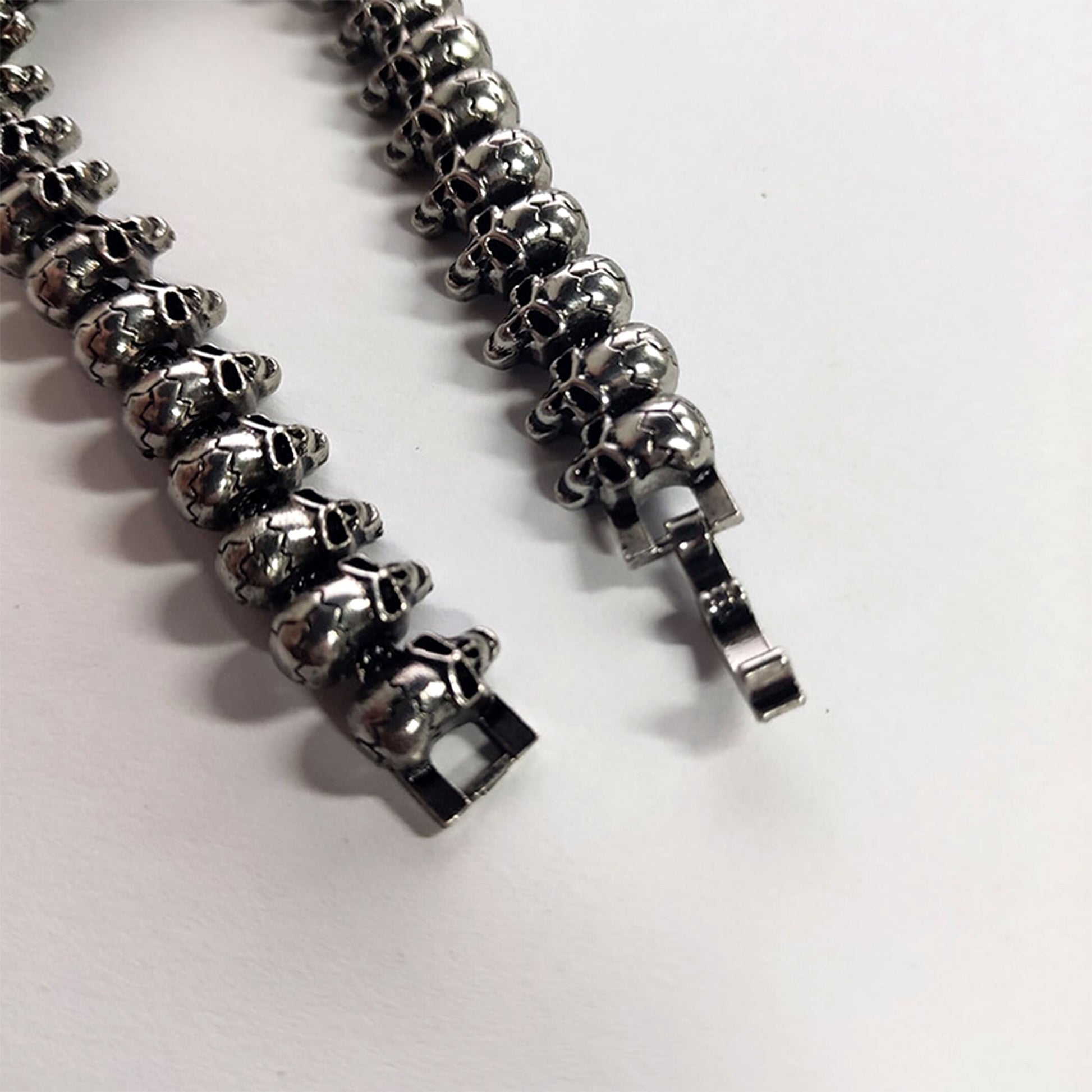 Introducing the Men's Skull Metallic Wristband Bracelet - the perfect accessory for those who embody a hip-hop, rock, or punk style. This stunning silver bracelet features a link chain and intricate skull design, making it a must-have for any guy's jewelry collection. With a hidden-safety clasp, it's both stylish and secure. Perfect for Halloween or as a unique gift idea, this bracelet from CALACAMANIA™ is sure to inspire strong emotions and add a touch of edginess to any outfit. Get yours today and embrace your inner rebel!