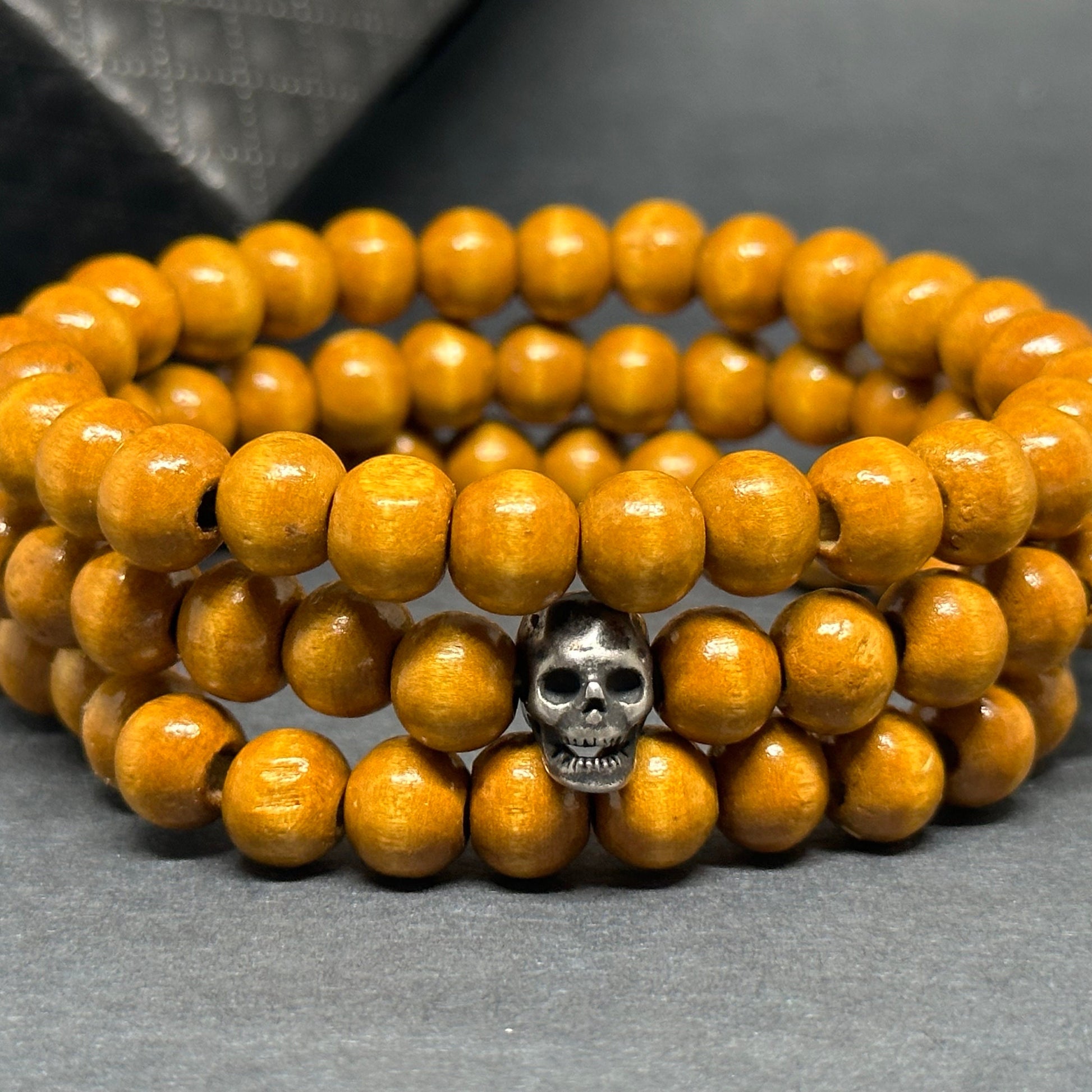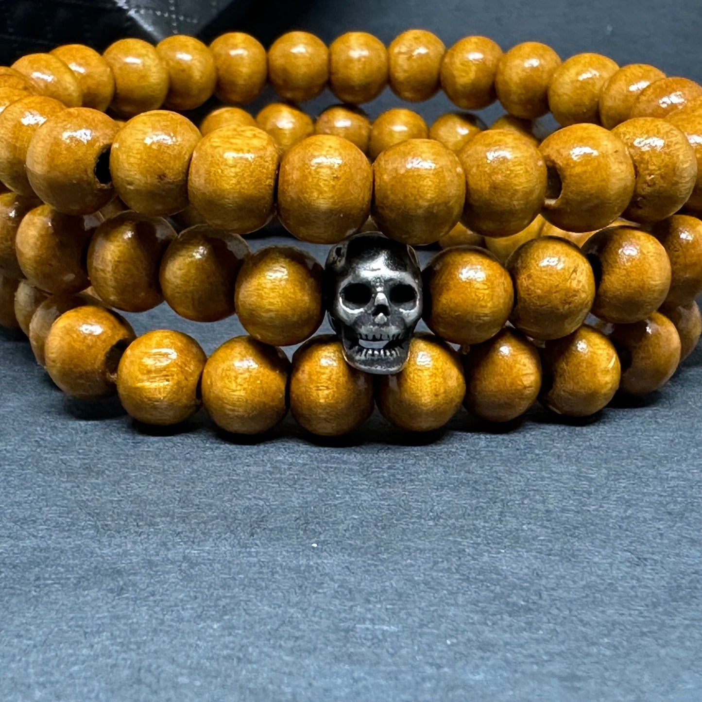 Multilayered Wooden Skull Elastic/Stretch Bracelet Set: Handmade and hand painted natural wooden wristband set (3pieces) with one loose rustic metallic skull bead. Simple yet cute fashion accessory for men. Lightweight casual outfit wristband set for man. Mix and match (all separate/individual bracelets). Boys/guys cool and original gift idea.