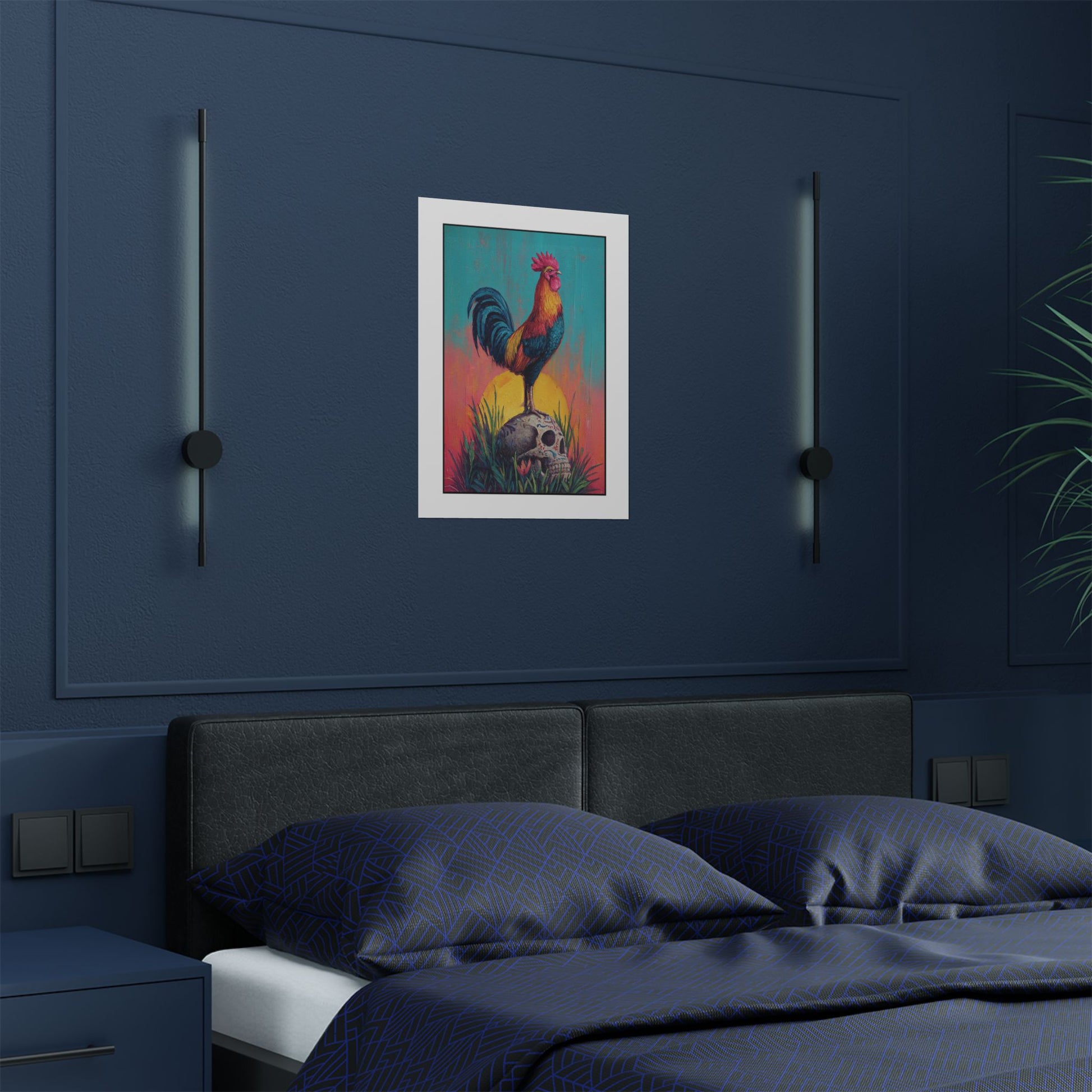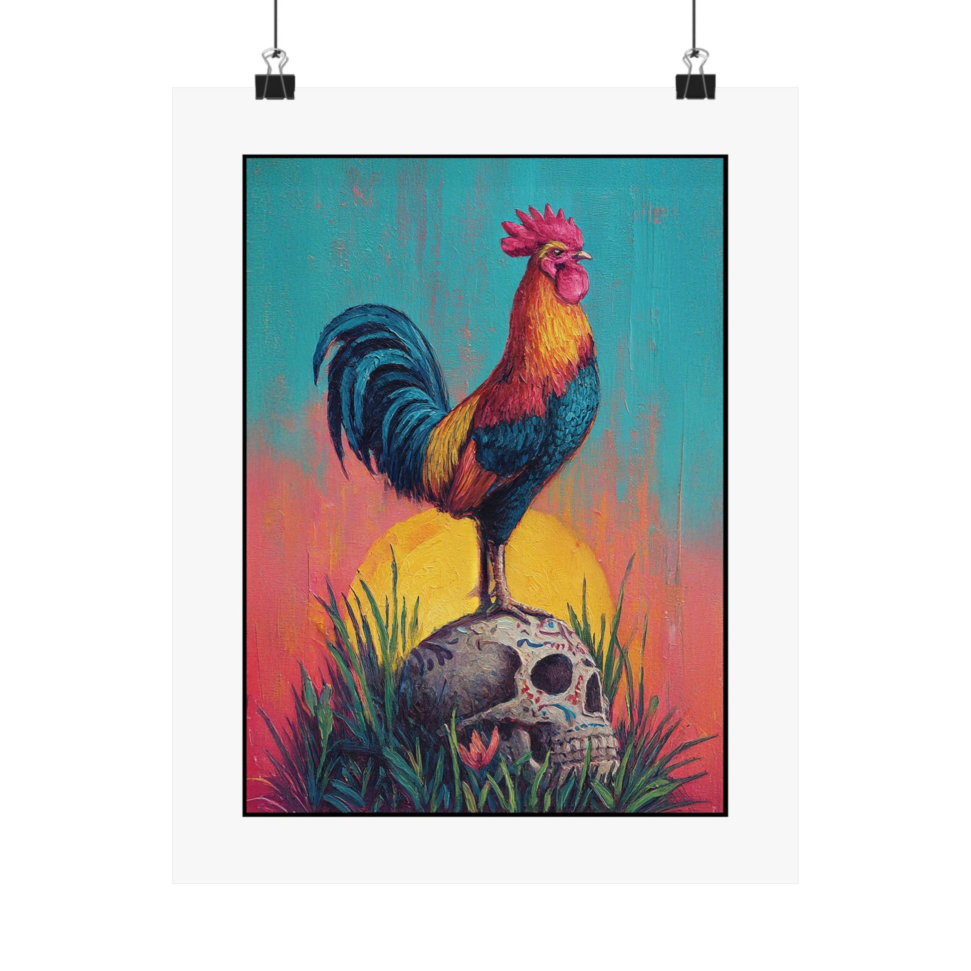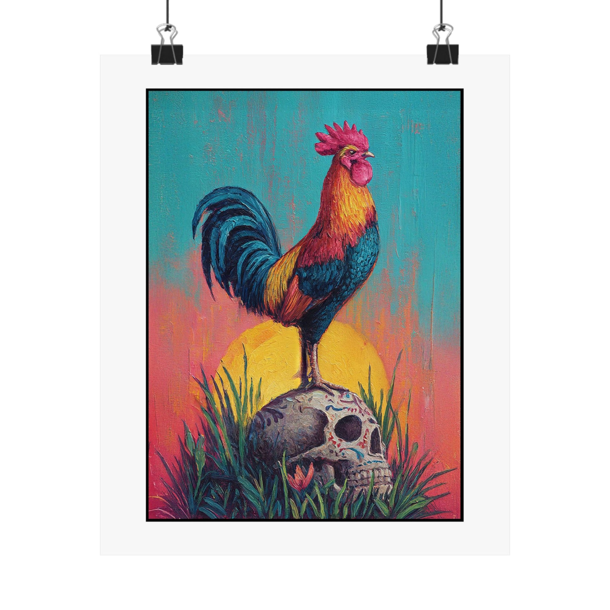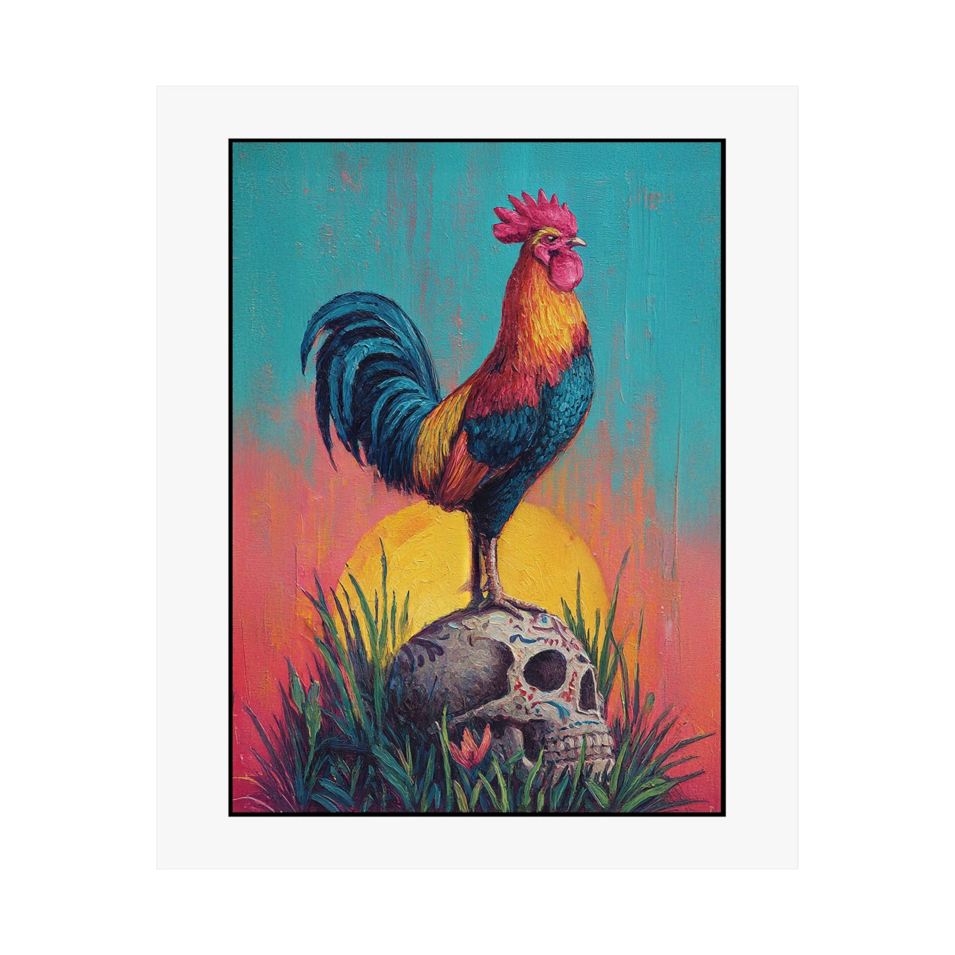 This satin poster brings a bold, contemplative scene into your room — a proud rooster standing atop a Mexican calavera beneath a radiant sun, rooted in wild grass. The composition balances life and death, courage and acceptance, inviting quiet reflection each time you pass it. Hang it where you pause: above a desk to spark thoughtful work, in an entryway to set a courageous tone for the day, or near a reading nook to deepen moments of introspection. The intense colors and low-glare satin finish make the imagery glow without overwhelming the space, while the museum-grade weight keeps the piece feeling substantial and lasting. It’s for people who appreciate symbolic, conversation-starting art that reminds them to meet life and mortality with awareness and bravery.