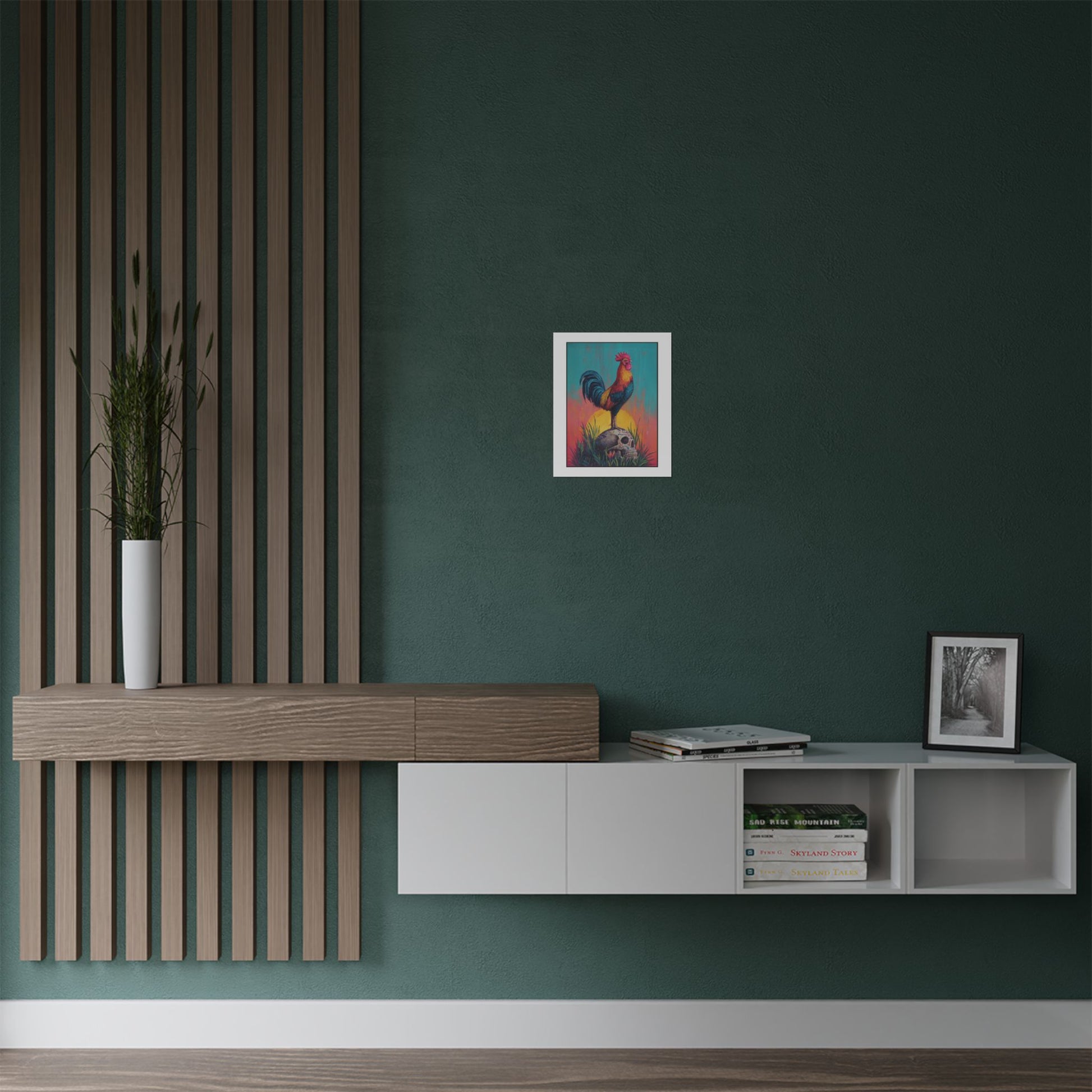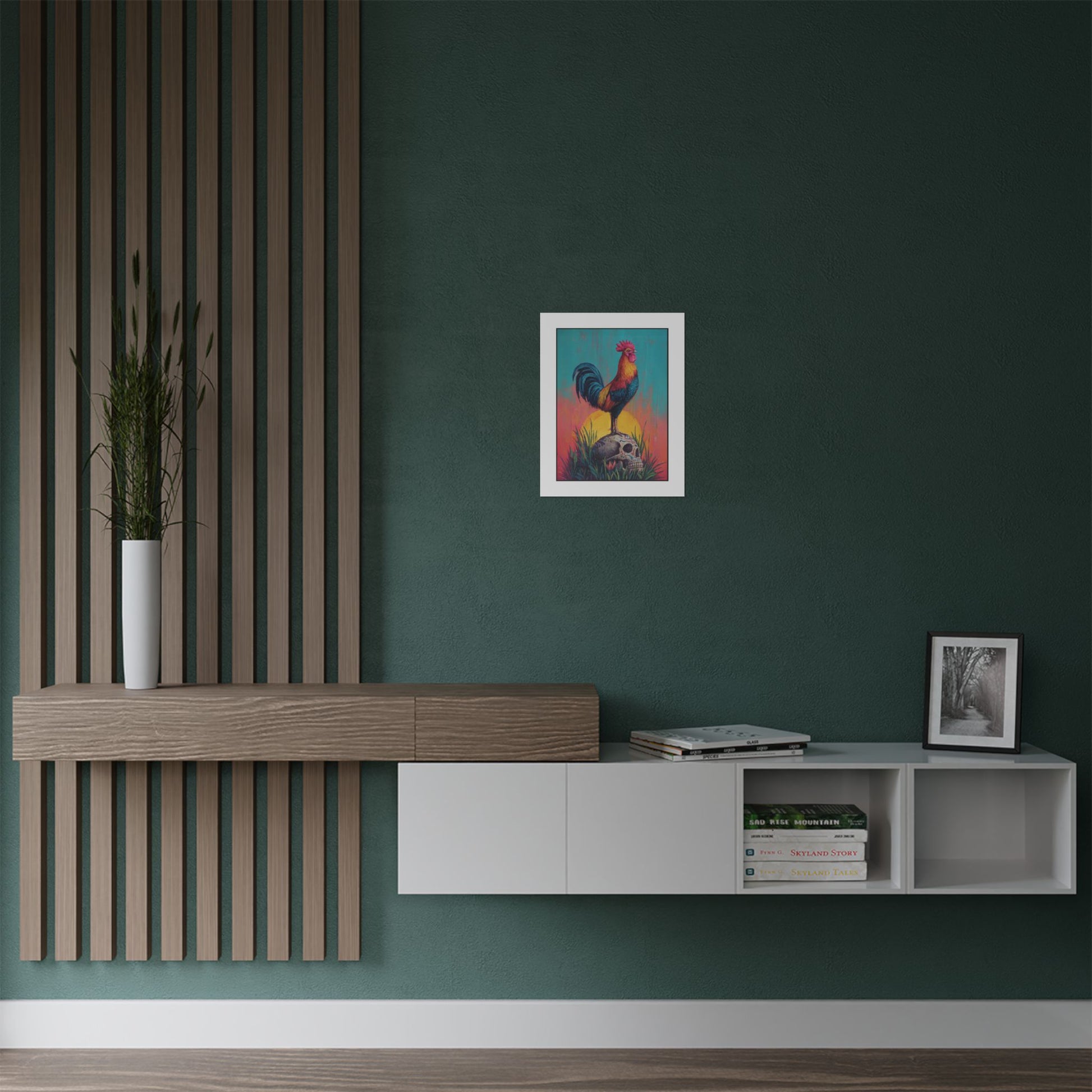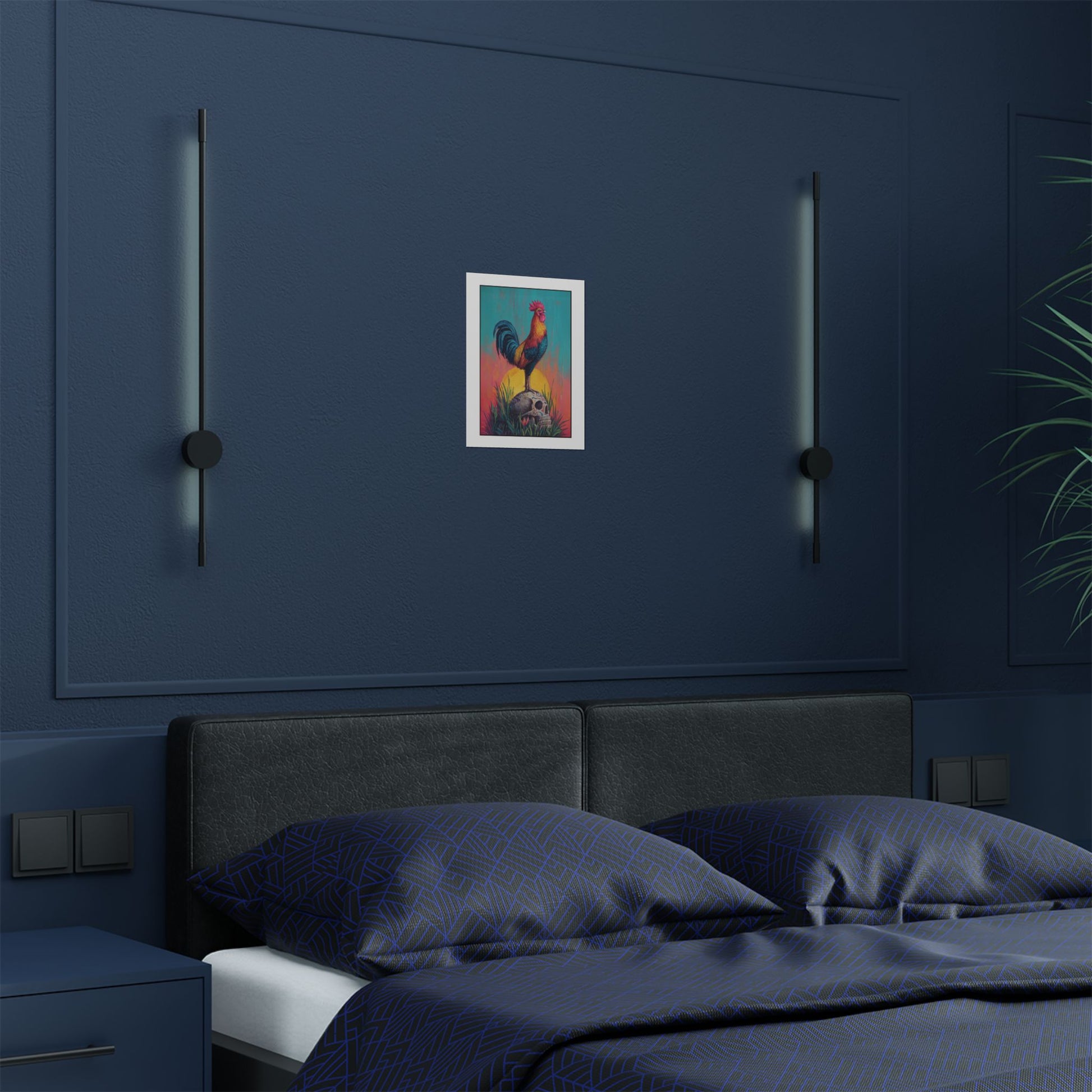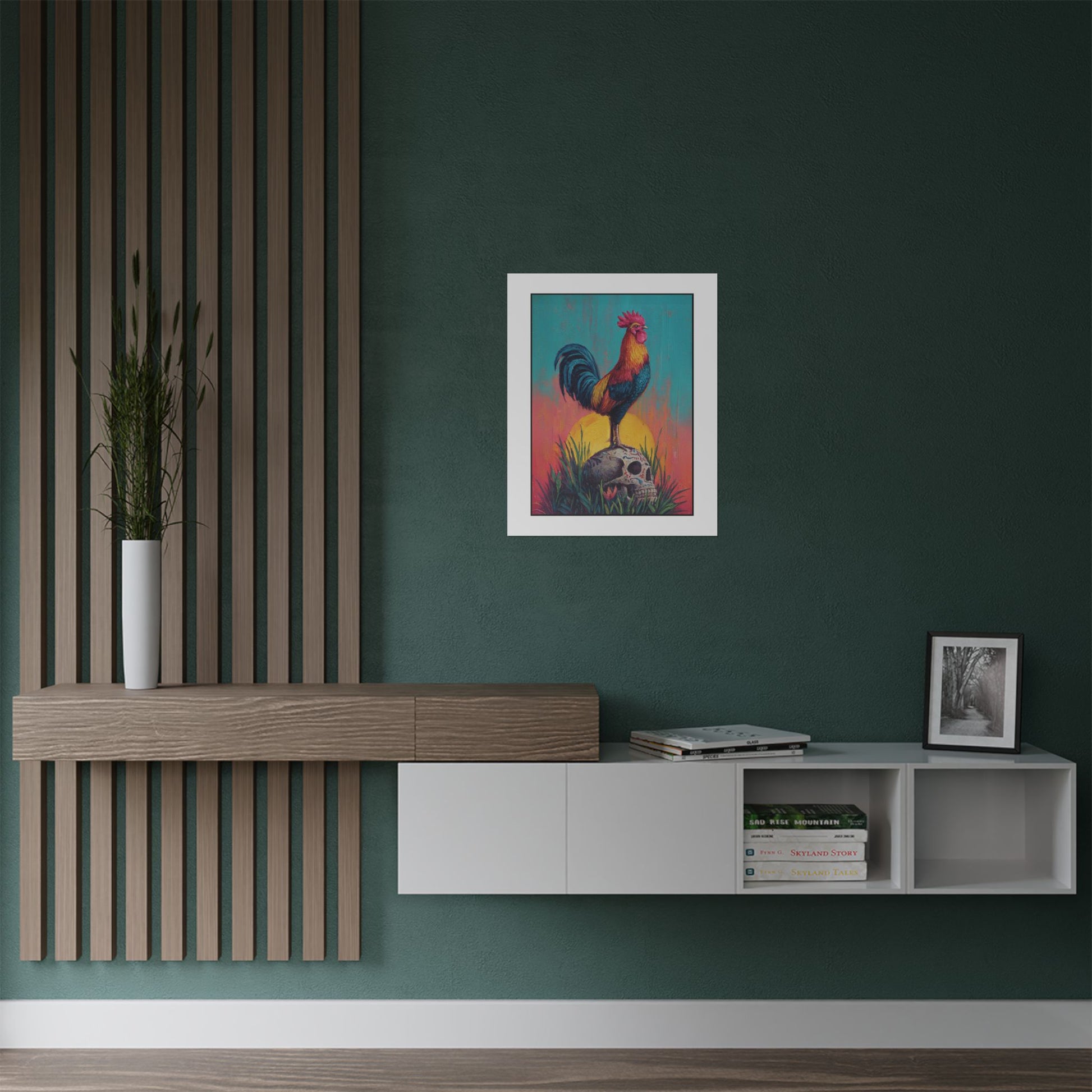 This satin poster brings a bold, contemplative scene into your room — a proud rooster standing atop a Mexican calavera beneath a radiant sun, rooted in wild grass. The composition balances life and death, courage and acceptance, inviting quiet reflection each time you pass it. Hang it where you pause: above a desk to spark thoughtful work, in an entryway to set a courageous tone for the day, or near a reading nook to deepen moments of introspection. The intense colors and low-glare satin finish make the imagery glow without overwhelming the space, while the museum-grade weight keeps the piece feeling substantial and lasting. It’s for people who appreciate symbolic, conversation-starting art that reminds them to meet life and mortality with awareness and bravery.