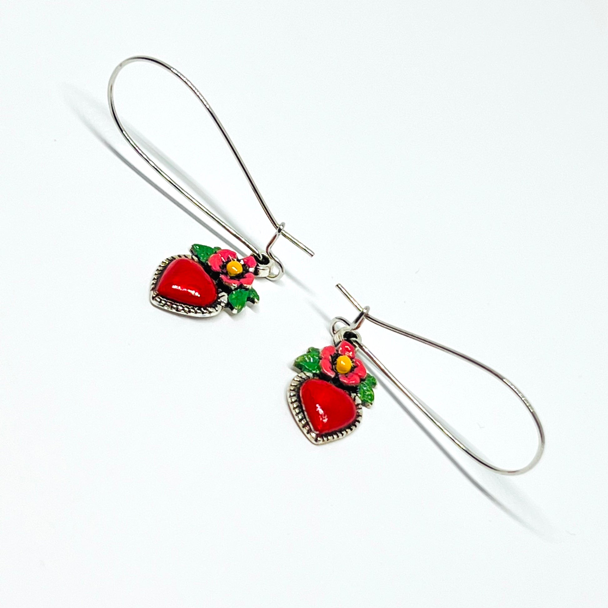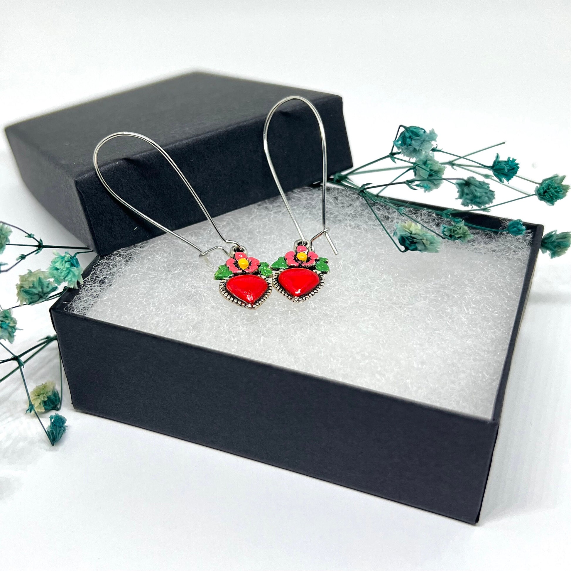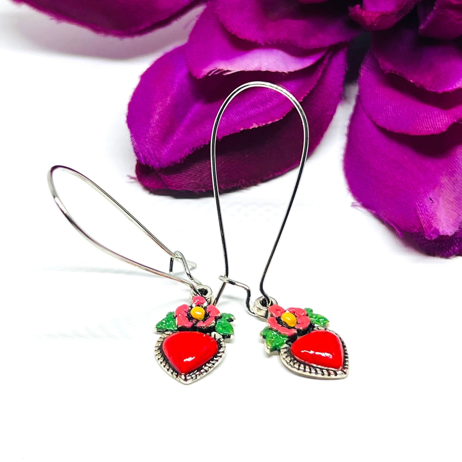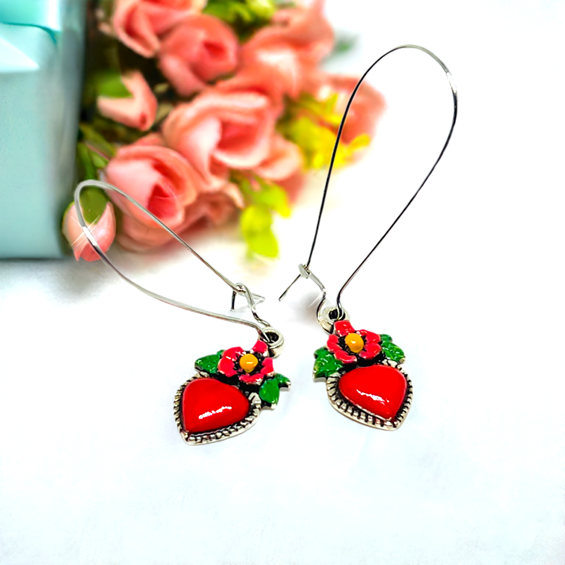 Discover the perfect, unique and budget-friendly gift for yourself or a loved one with these delightful Silver Plated Long Kidney Ear Wires Heart Earrings! Hand painted and handcrafted with intricate details, these Vintage Style Flowered Hearts will surely capture your heart. Embrace the passionate and inspiring world of Frida with these must-have earrings.