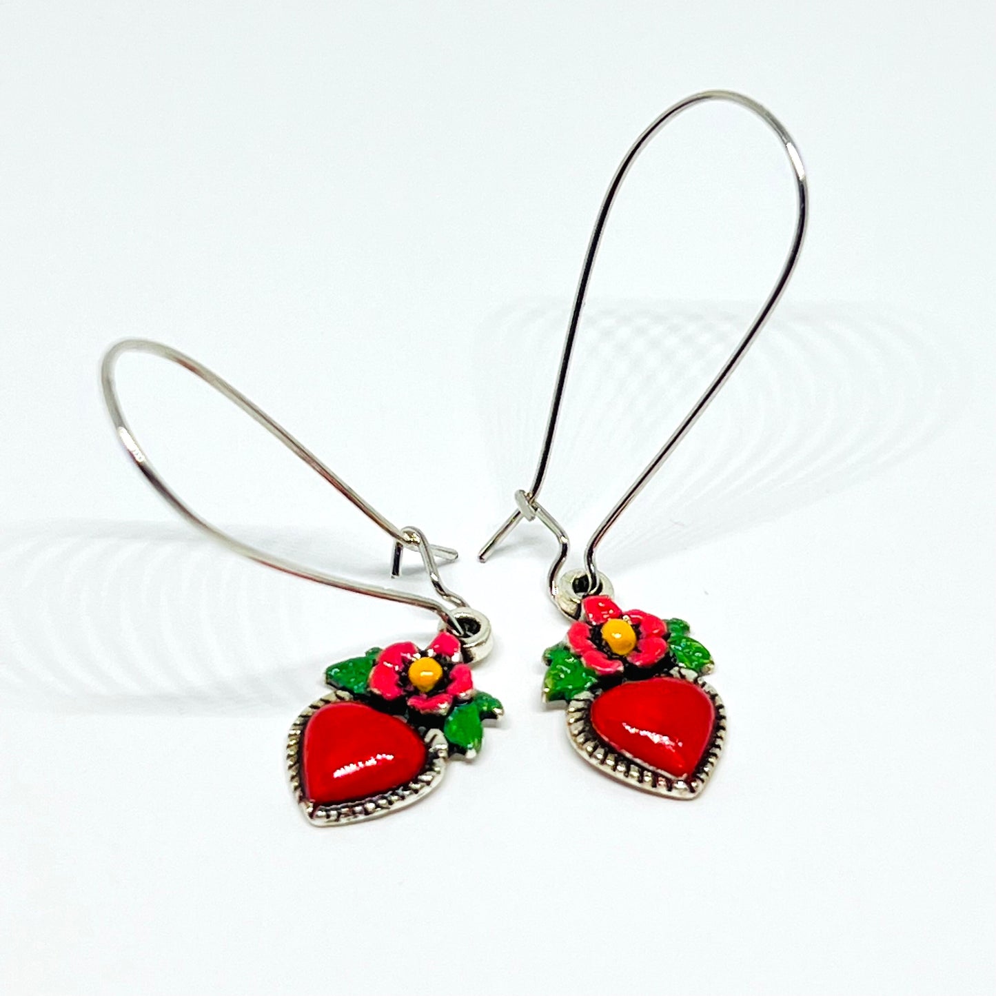 Vintage Style Frida Inspired Red Enamel Heart Earrings