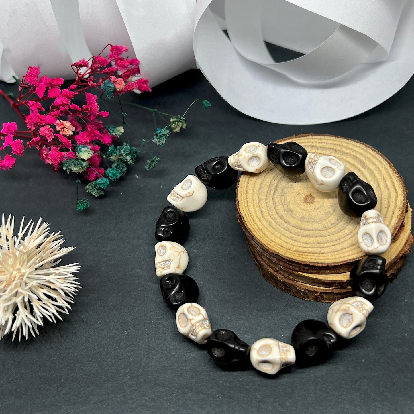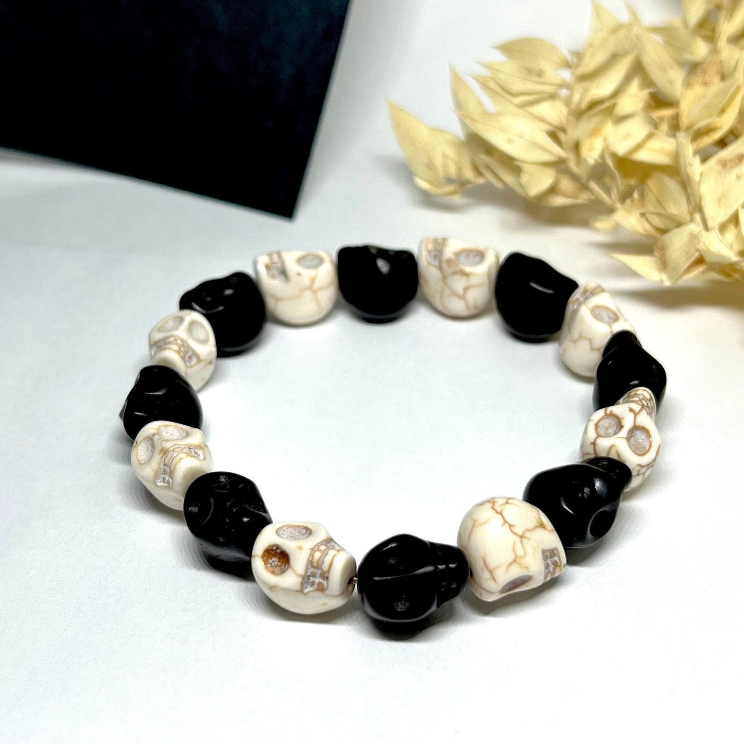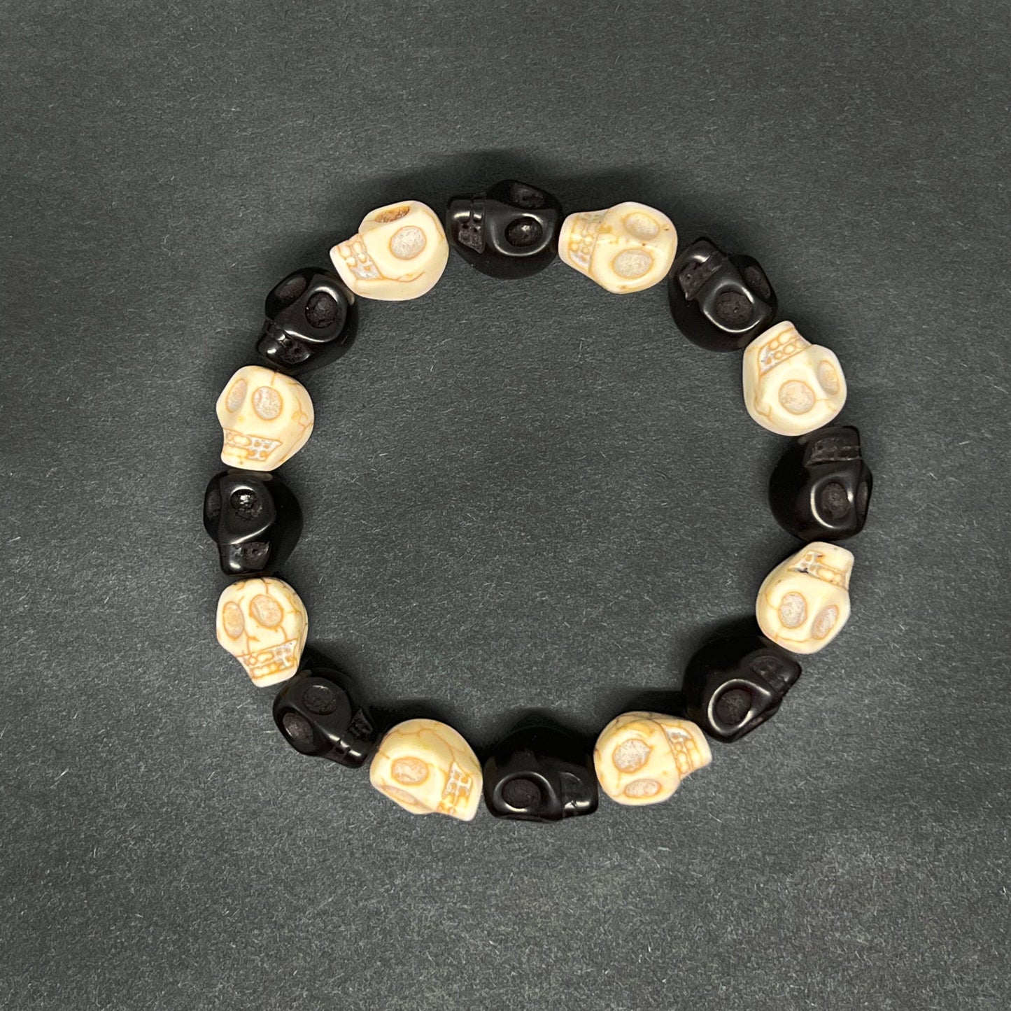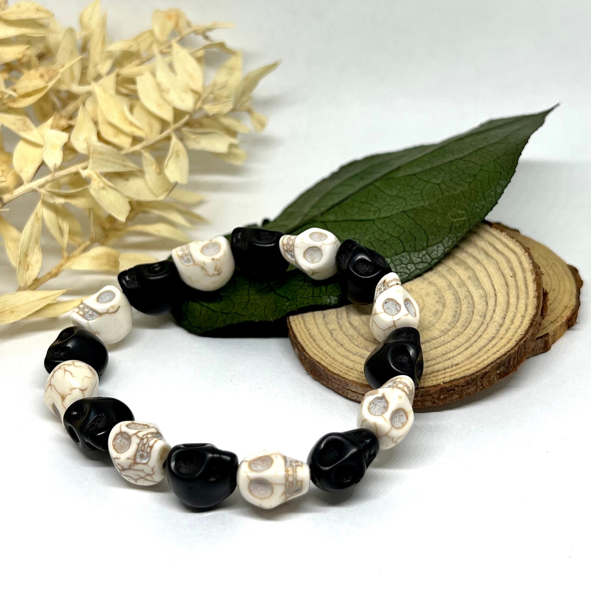 Bold and Unique Black and White Skull Beaded Wristband Bracelet