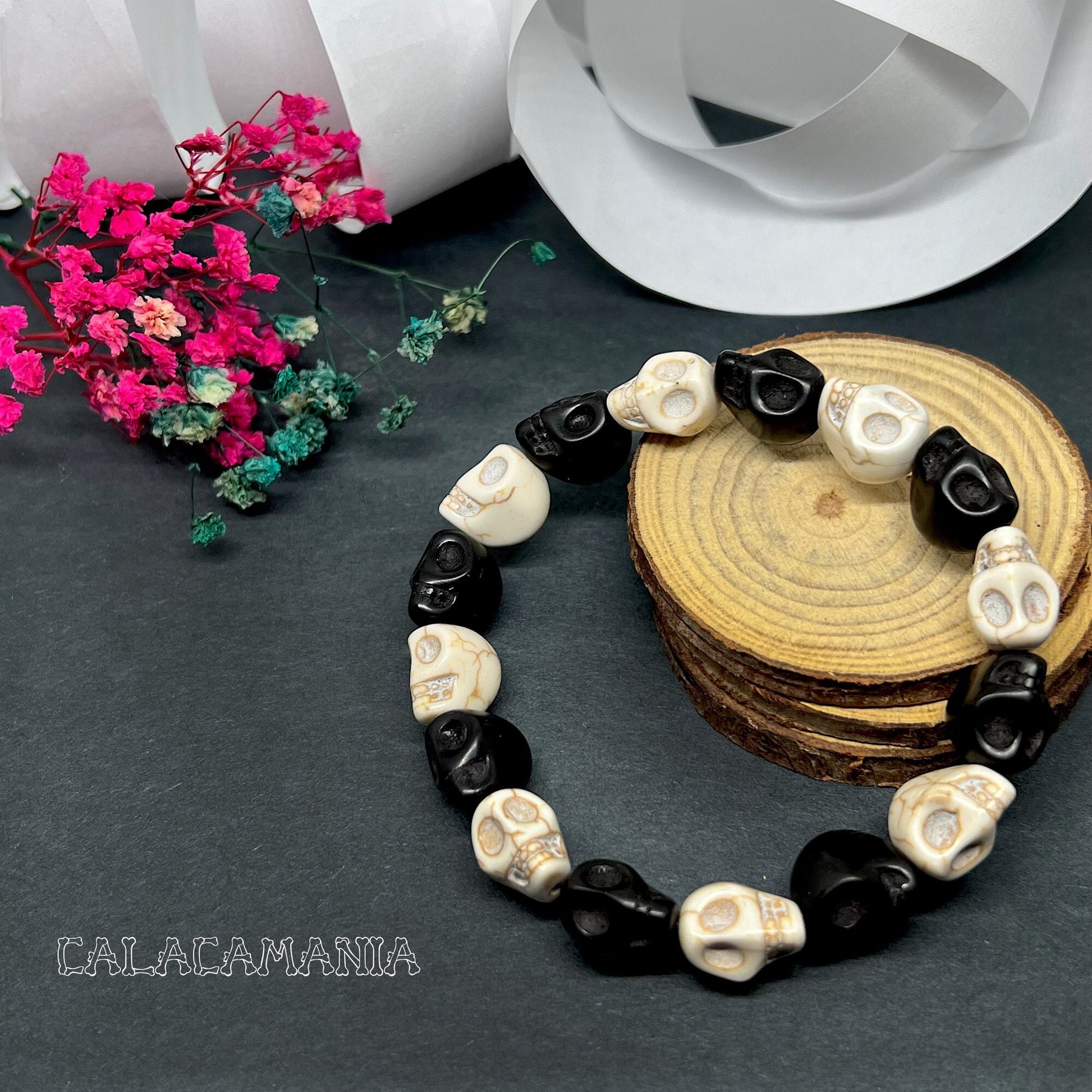 Experience the bold and unique style with this striking Skull Beaded Wristband Bracelet. The alternating black and white beads add a touch of contrast to this Day of the Dead inspired jewelry that is perfect for anyone. Show your passion for fashion and celebrate Halloween in style with this cool accessory. Makes a great gift for him or her. ¡Consigue ya tu pulsera de calaveras y demuestra tu entusiasmo por la moda y la vida!