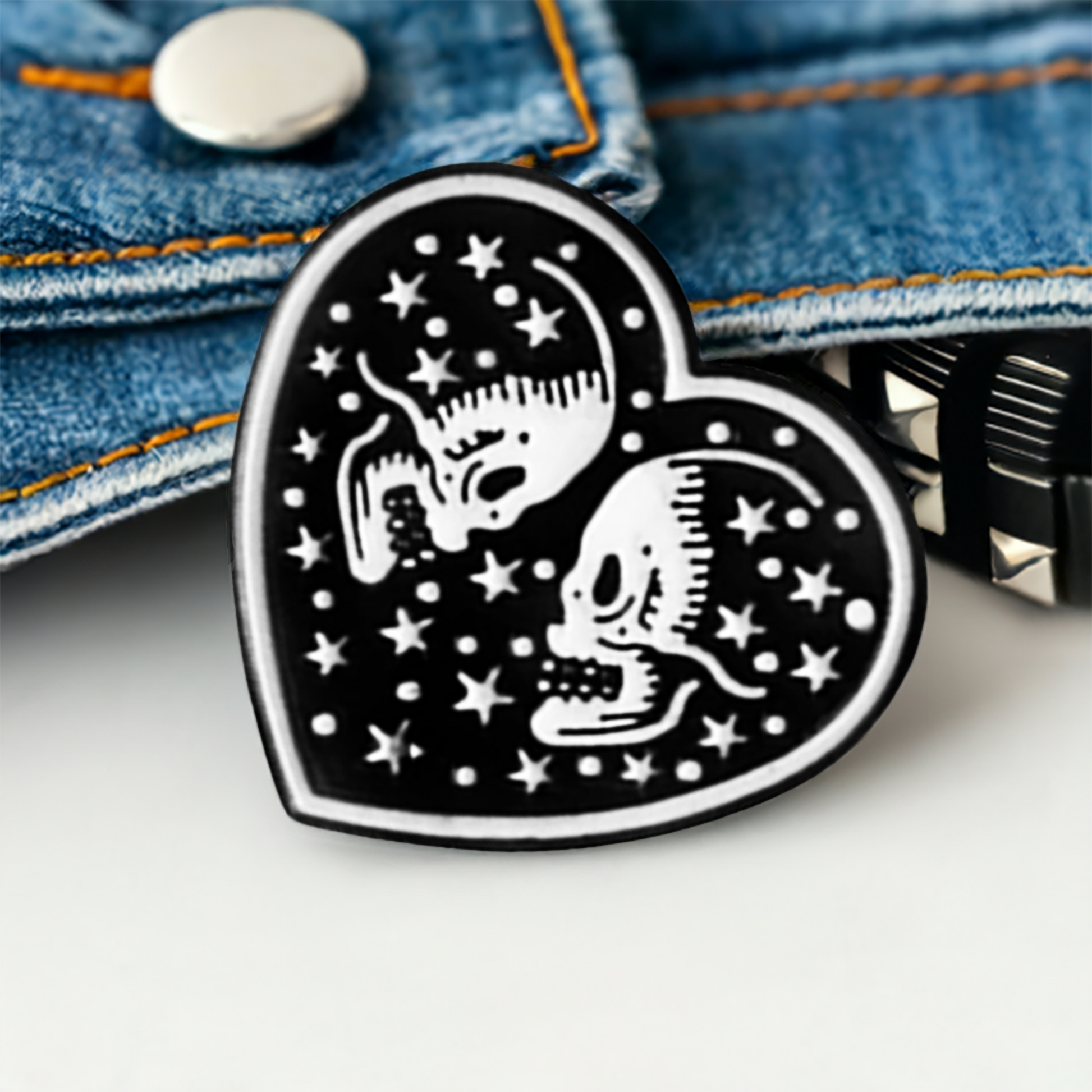 Indulge in the perfect gift for yourself or a loved one with this Vintage Lovers Skull Heart Enamel Pin - a unique and stylish accessory featuring black and white skull designs. Express your edgy style and love for all things gothic and punk with this exquisite piece from our brand CALACAMANIA™. Perfect for modern girls, this pin adds a stunning touch to any denim jacket. Don't miss out on this must-have addition to any skull jewelry collection!