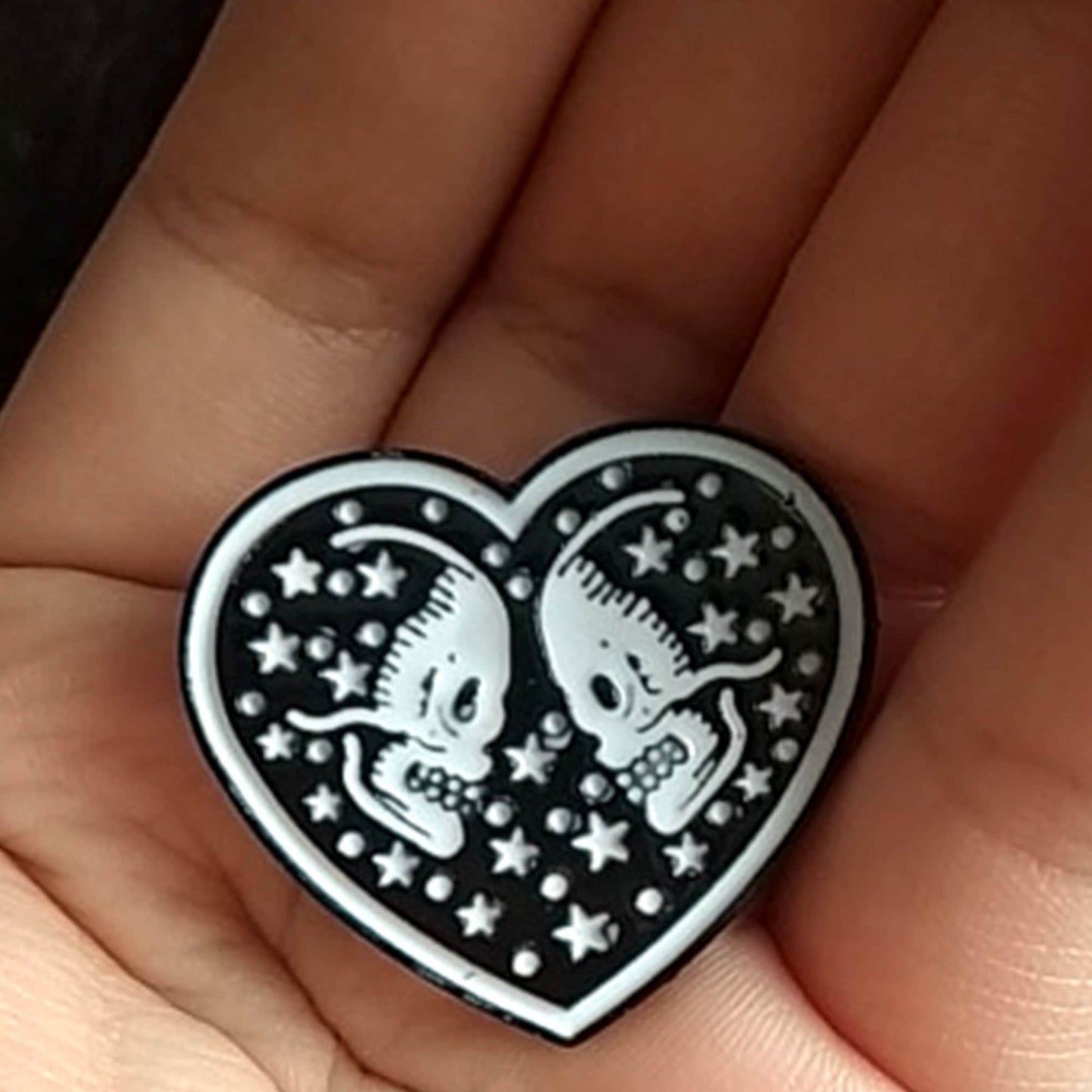 Vintage Lovers Skull Heart Enamel Pin - Metallic Brooch