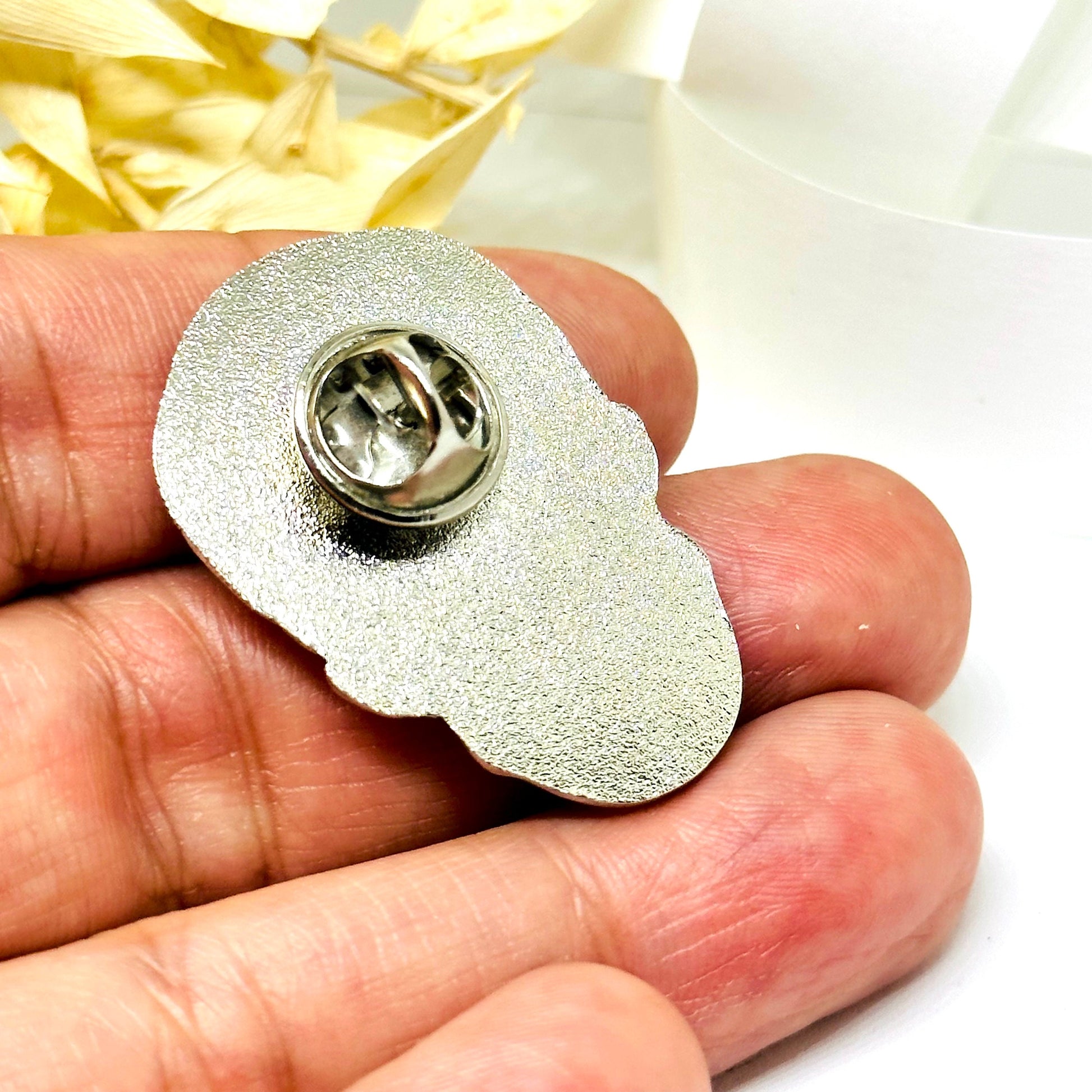 Sparkling Sugar Skull silver chrome tone pin brooch. This brightly pinback button was created inspired by Mexican Sugar Skulls, which unlike the ghoulish skulls and skeletons associated with Halloween, represent the departed souls in the cirlce of life. The calavera (a word that means “skull” in Spanish but that has come to mean the entire skeleton) has become one of the most recognizable cultural and artistic elements of the Day of the Dead festivities. This shiny skull pin made from silver chrome tone metal and embellished with artfully designed carved designs is a joyful, celebratory figure. Very cool gift idea!