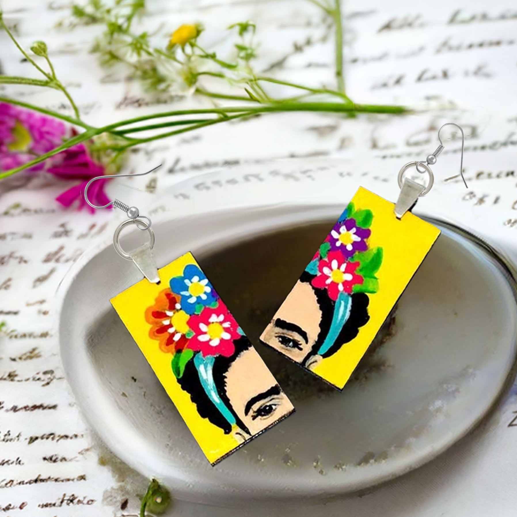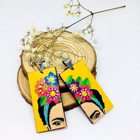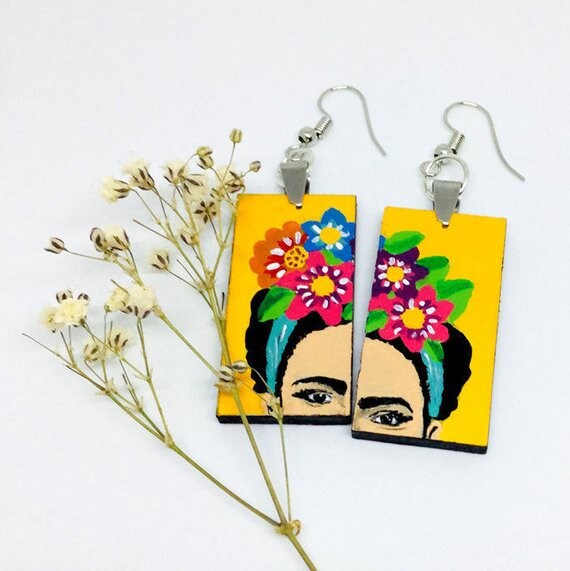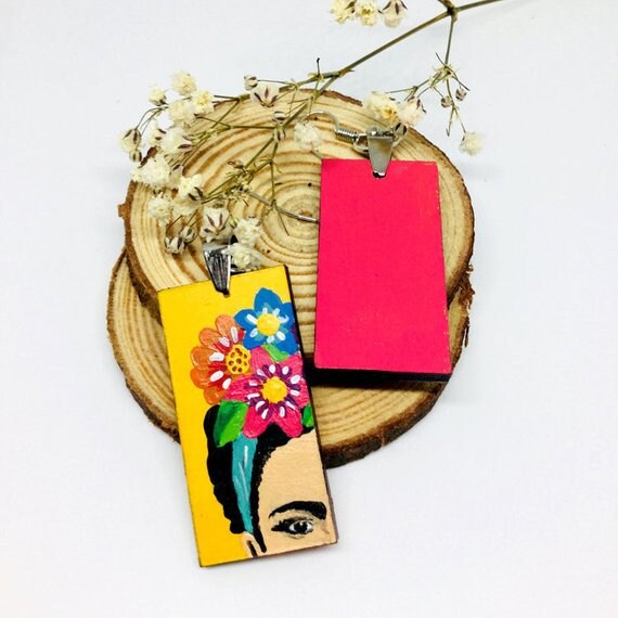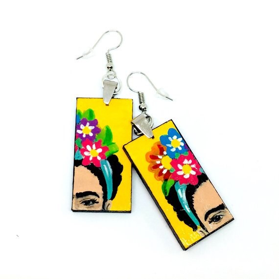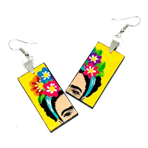 Express your unique and fearless self with these fabulous & colorful floral Frida earrings. Inspired by Frida Kahlo's vibrant style, these hand painted beauties make a statement about your personality. Add a touch of fun and liveliness to any casual outfit with these one-of-a-kind accessories.